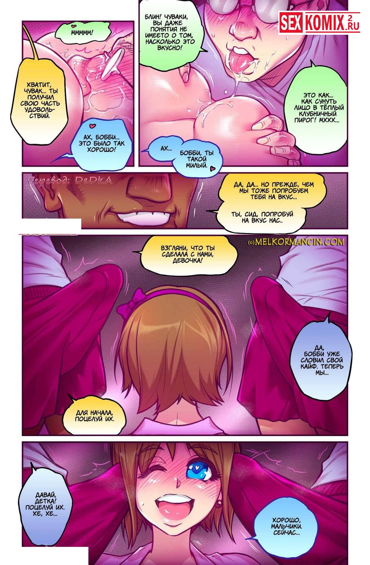 Порно комикс Сидни. Часть 2. Девушку по имени Сидни трое парней пригласили подсобное помещение, чтобы заняться с ней сексом вчетвером. Девушка с удовольствием на это согласилась, она хотела новых ощущений. Парни предлагали отсосать у них члены, что она сразу же и сделала, после этого они уже не могли остановиться и хотели продолжение. Они сняли с неё трусики и трахнули её втроём. Но не внезапно в помещение зашел дядя этой девушки, он разогнал проказников, которые домогались до его красотки. Но поскольку она была голая, он и сам возбудился от ее виды. Мужчина не смог удержаться и отлизал сочную киску.