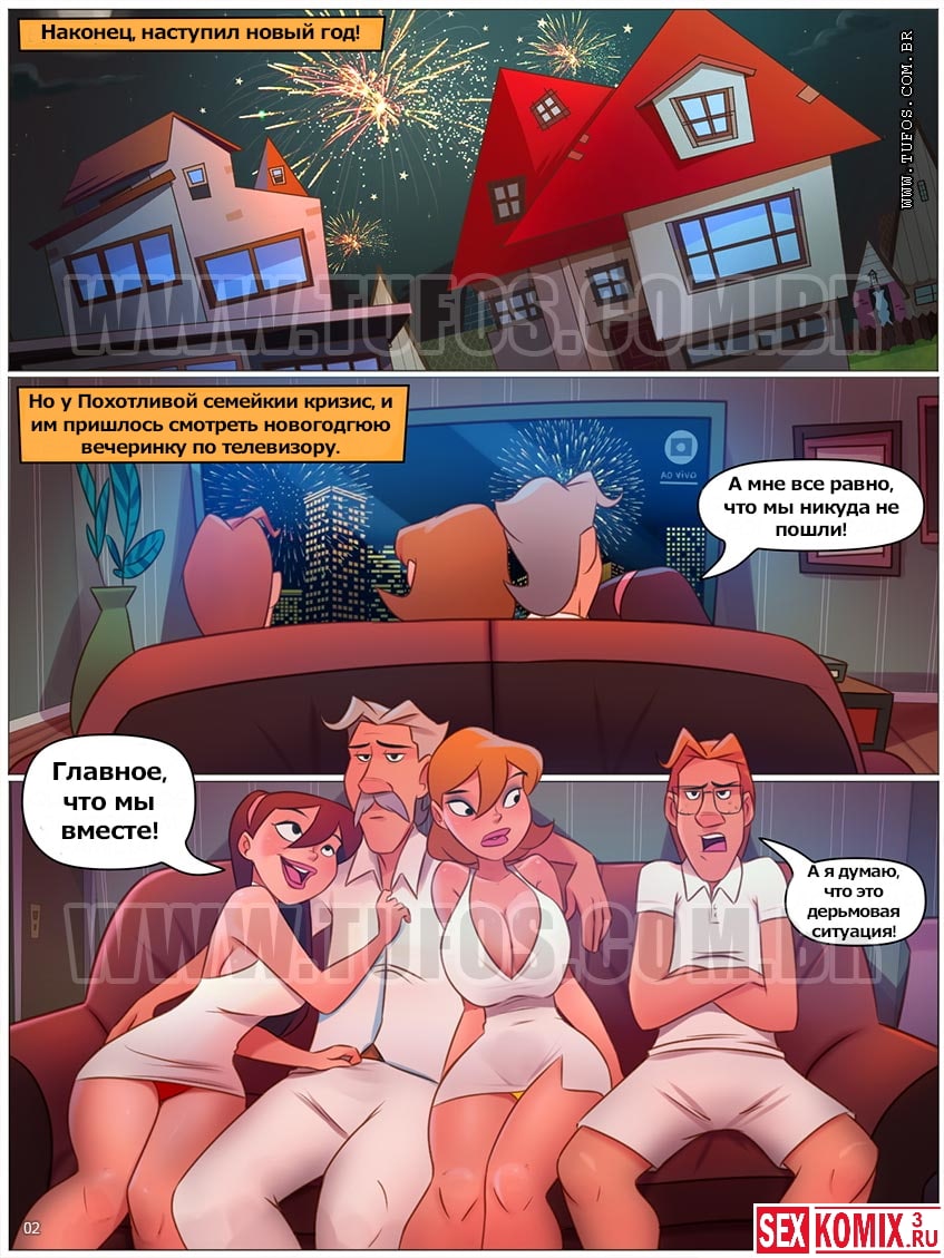 Порно комикс Похотливая семейка. Часть 77. Новогодняя ночь Развратосов. В новогоднюю ночь, многие семьи отправились в цент города, чтобы встретить год вместе со всеми, но Развратосы решили остаться дома. И по началу, эта идея понравилась только Анине. Но потом Мария начала показывать, что на ней счастливые желтые трусики и Анина показала свои красные трусики любви. Мужчины семейства возбудились от этой демонстрации и в этот момент девушки попросили их показать свои трусу, но кроме огромных стоящих членов ничего больше не увидели.