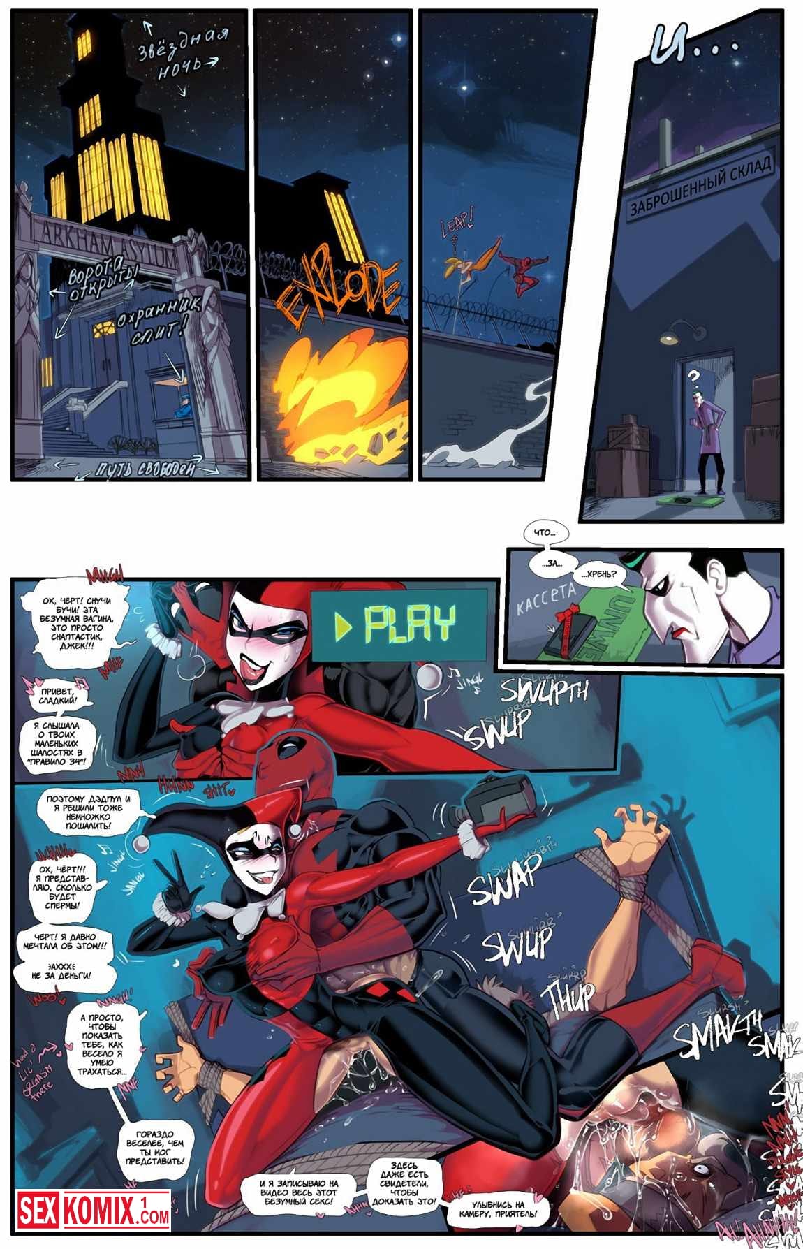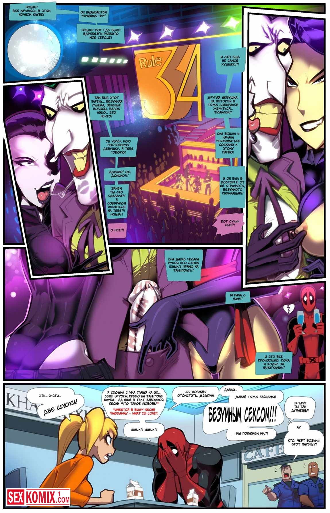 Порно комикс Харли Квин и Дедпул. Безумный секс. Сердце бессмертного Дедпула было разбито сразу двумя девушками, они его бросили. Одни из них изменила ему с Джокером. И мужчина в красном костюме пришёл плакаться к Харли Квин. Она прониклась к нему и предложила свою помощь, сказала, что хочет быть его девушкой. Чтобы вместе драться и конечно трахаться.