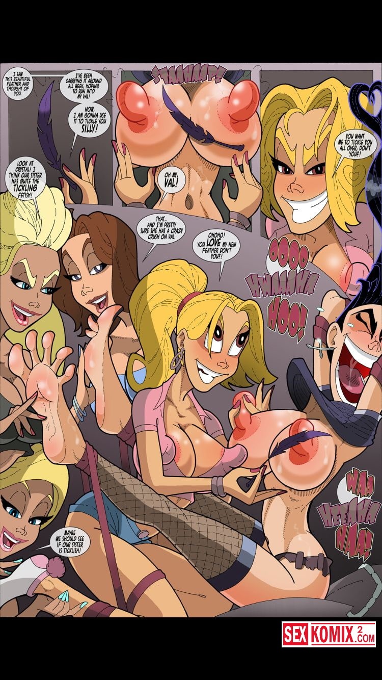 Порно комикс Вампирские записи. Английский. Брюнетка с большими сосками любит, когда ей щекочут. Лесби оргия началась с того, что ей привязали и начали щекотать ноги и тело.