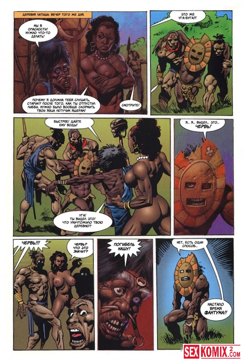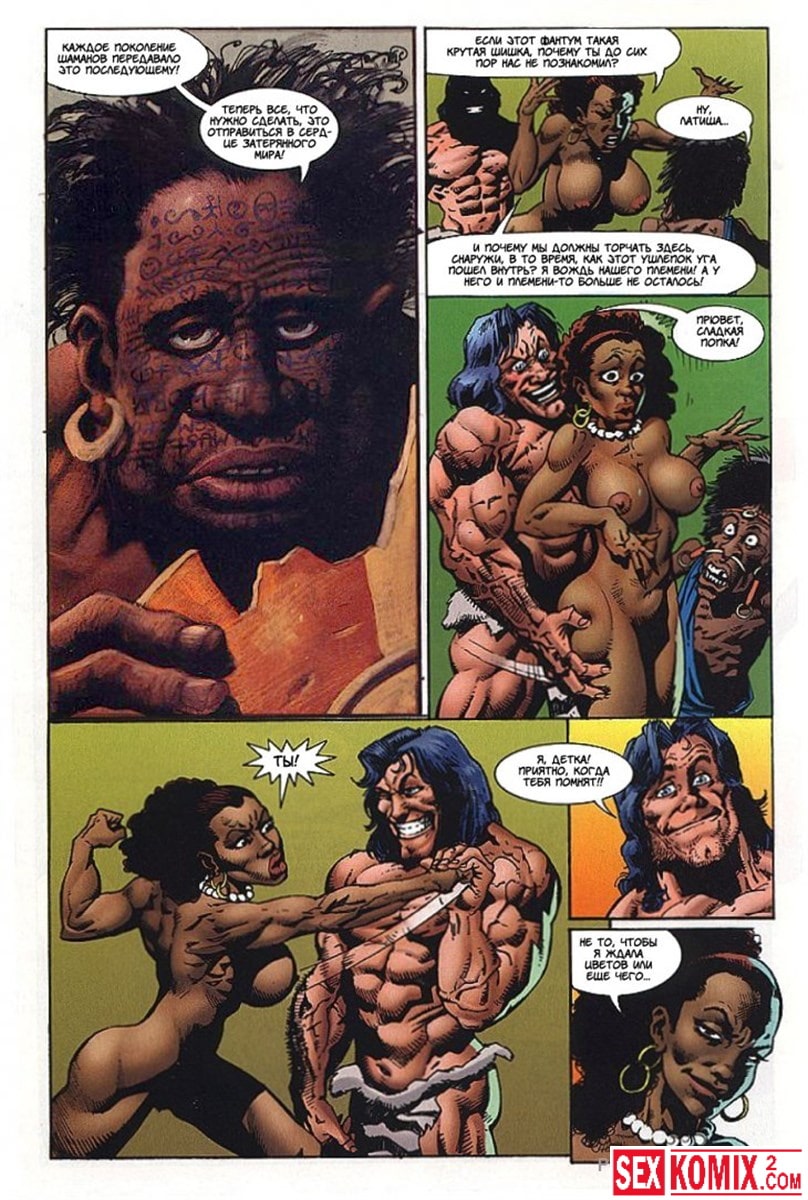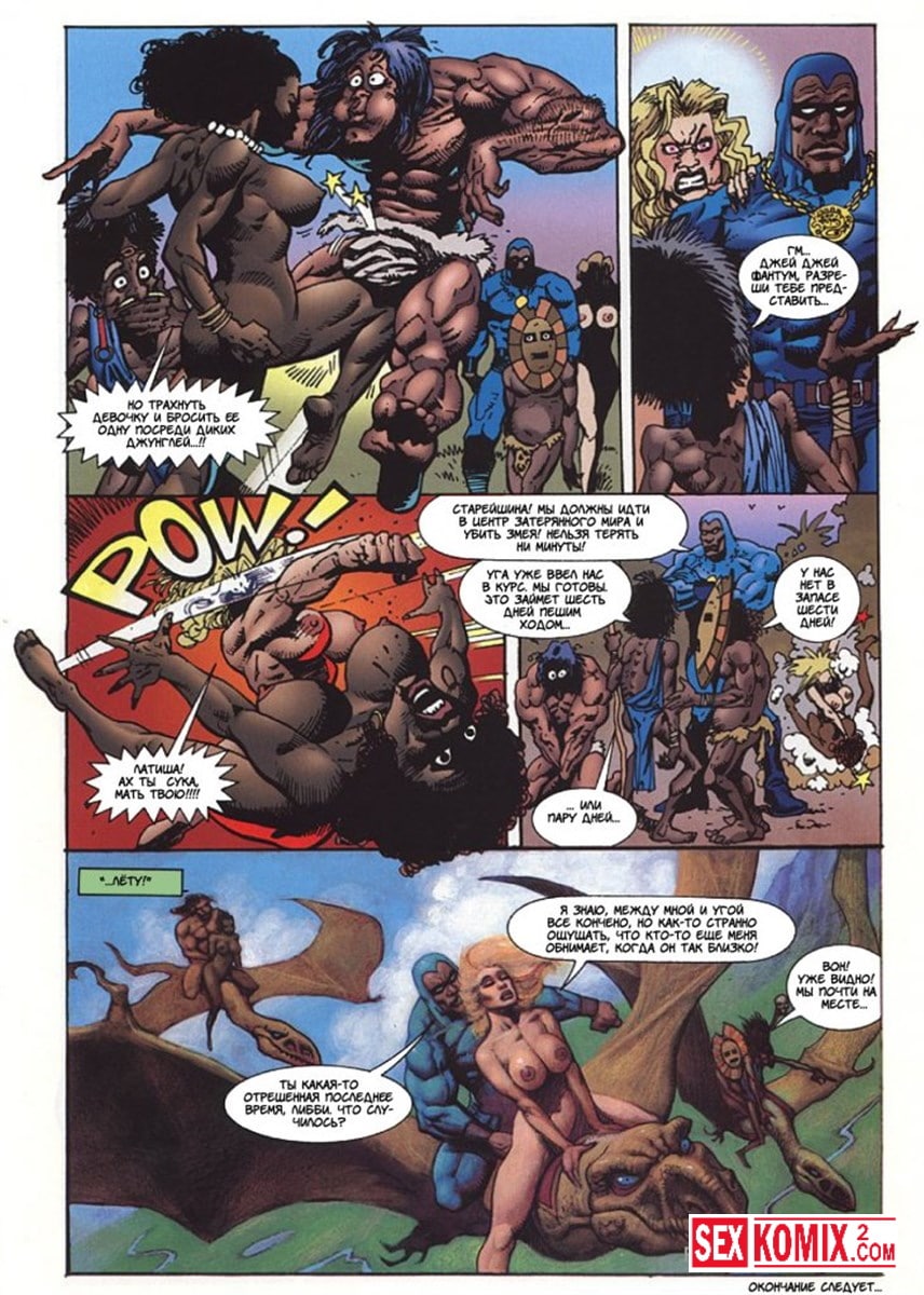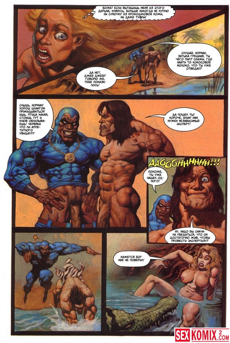 Эротический комикс Латиша и затерянный мир. Часть 3. Блондинка с шикарным телом продолжает выживать на фантастическом острове. Когда моется в озере, на неё пытается напасть гигантский крокодил. Но его прогоняют двое накачанных мужчин. Теперь красотка у них в долгу.