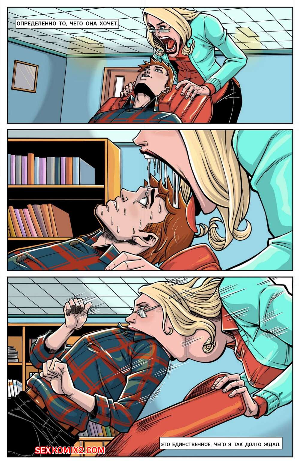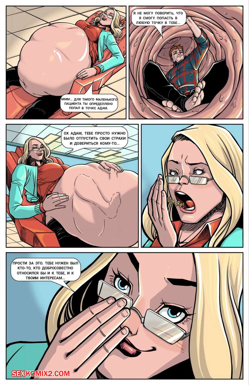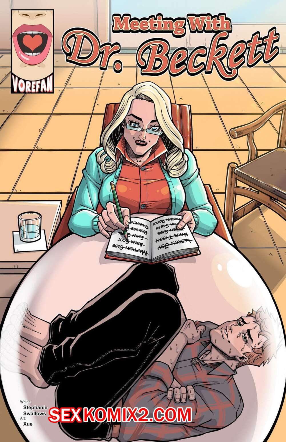 Порно комикс Встреча с доктором Беккет. Meeting with Dr. Beckett. Vorefan Парень пришел на прием к горячей сисястой блондинке, чтобы обсудить свои проблемы. Но у красотки были другие планы, она оголила перед ним свои сиськи, после чего полностью его в себя заглотила.