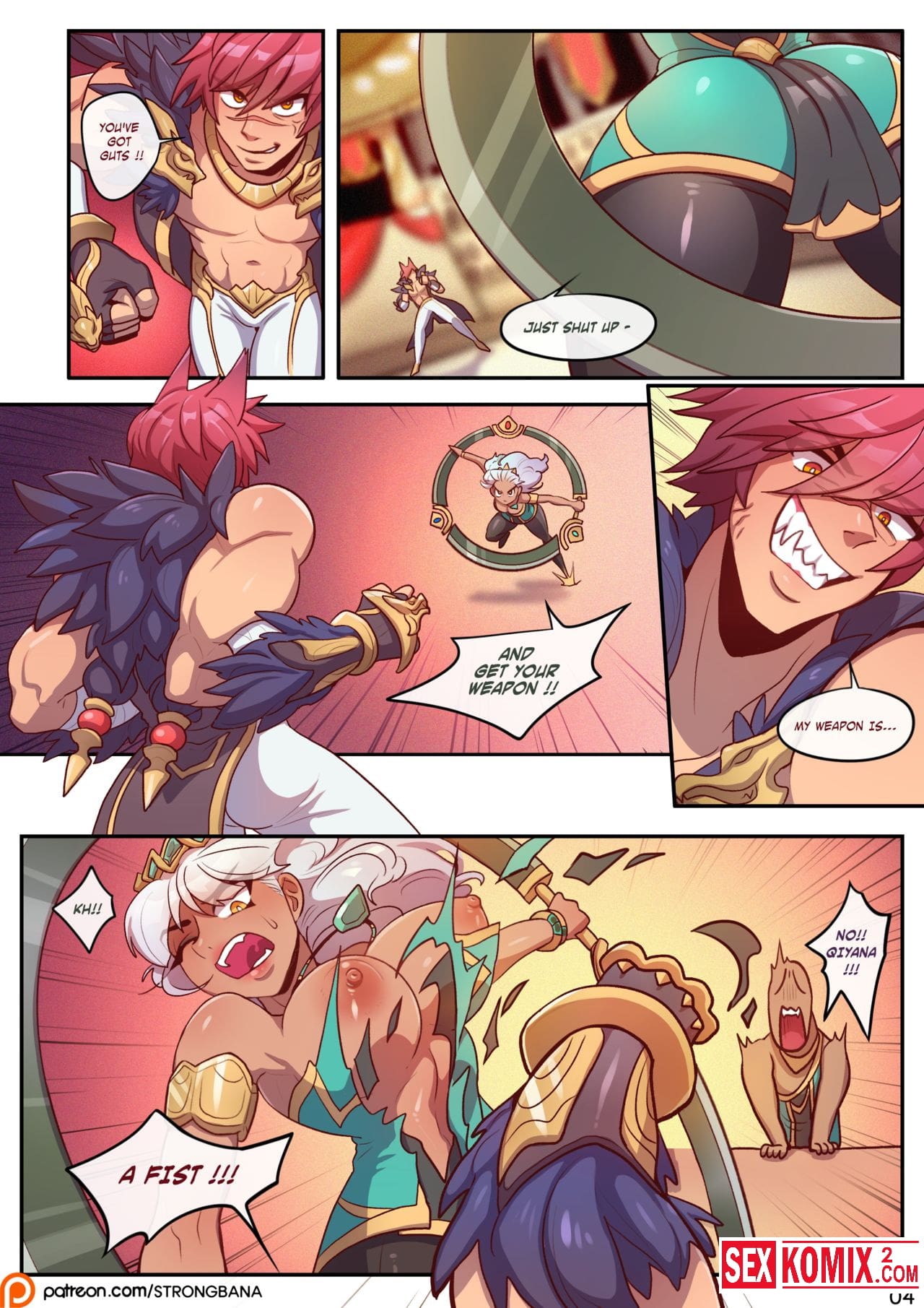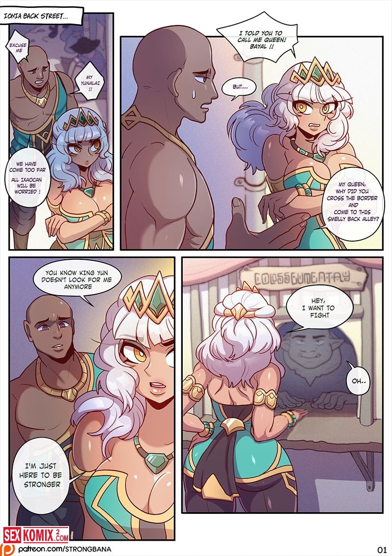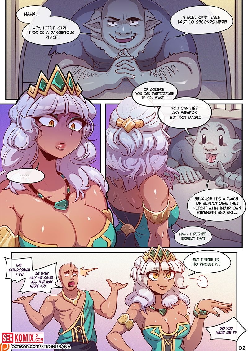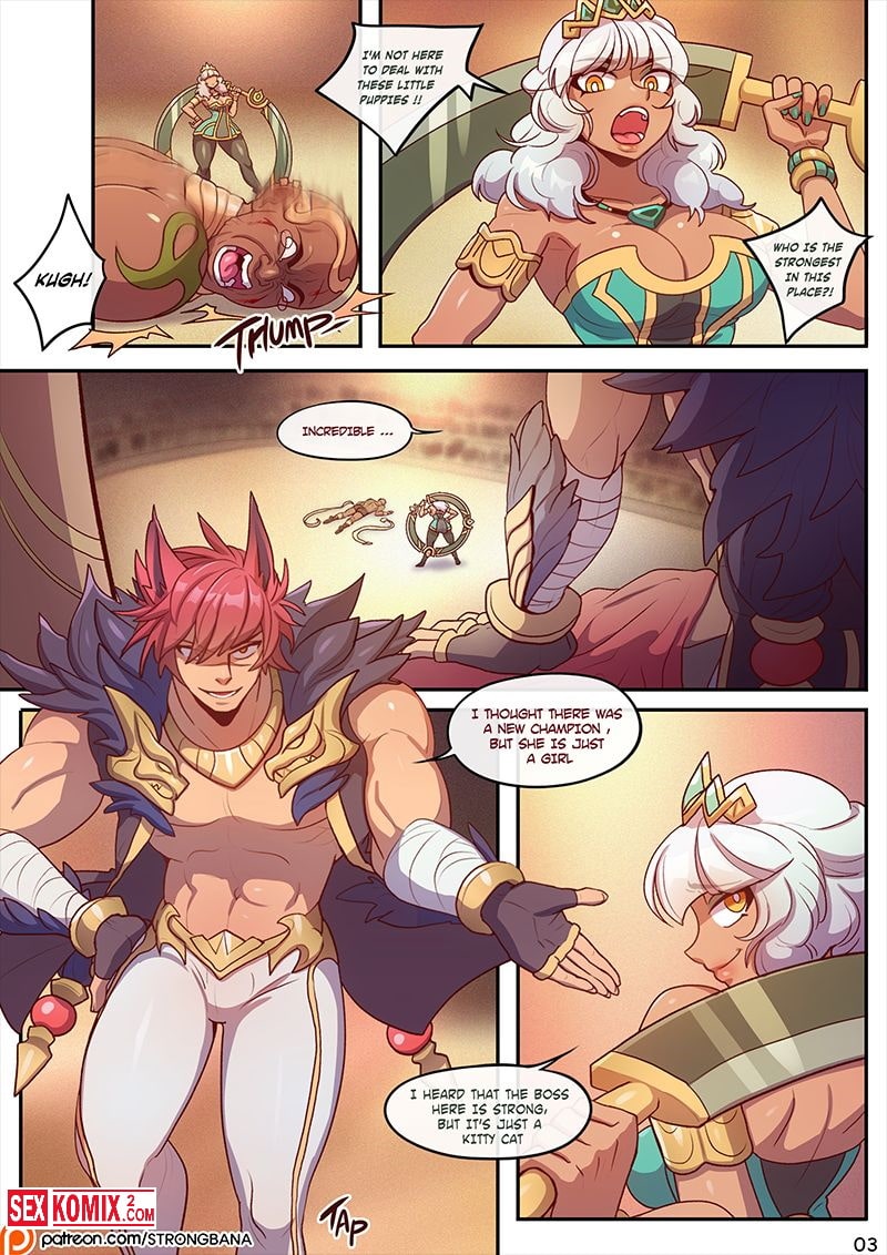 Порно комикс League of Legends Показать стоппер. Английский. Симпатичная блондинка с милым личиком и большими сиськами решила подзаработать денег и записалась на гладиаторские бои. Против неё поставили ловкого парня, во время боя он раздел красотку и на глазах большой публики трахнул девушку.