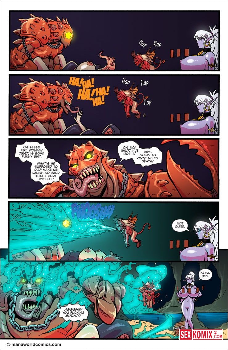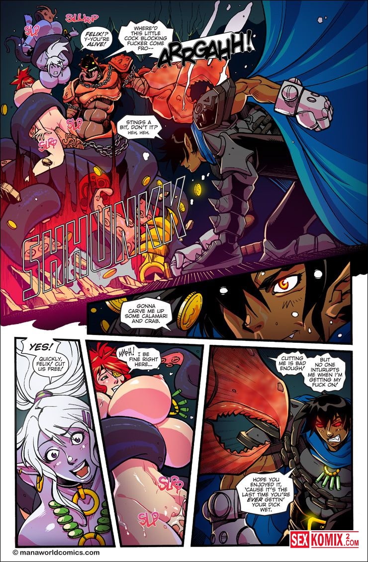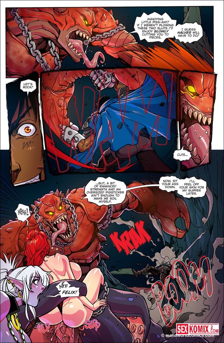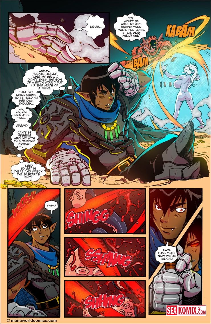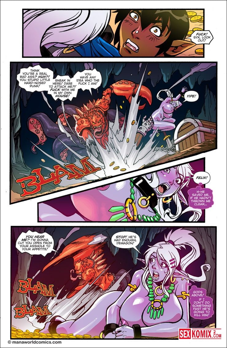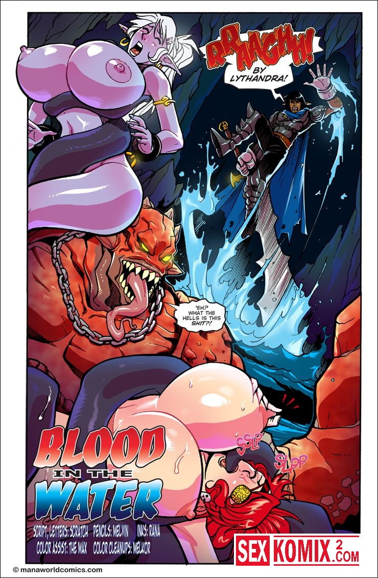 Порно комикс Mana World. Часть 11. Кровь в воде. Английский. Битва с подводным монстром продолжается, девушкам удалось вырваться из оков и эльфийка с большими сиськами прочитала заклинание. Она призвала демона из другого измерения на помощь и он спас красоток.