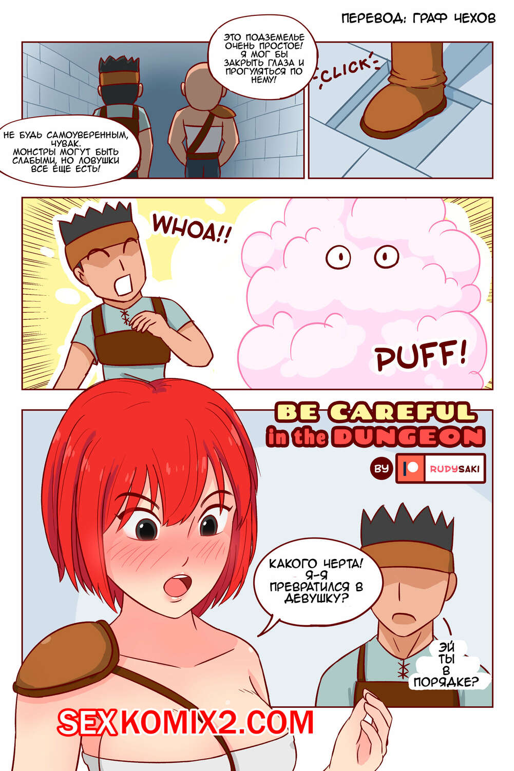 Порно комикс Будь осторожен в подземелье. Be Careful in the Dungeon Парень обменялся телами с горячей сисястой брюнеткой и они решили повеселиться и воспользоваться этим. Красотка разделась и стала сосать хуй парня, после чего дала ему себя выебать.