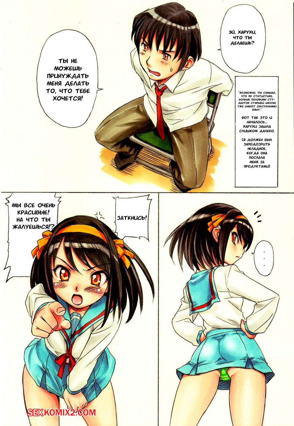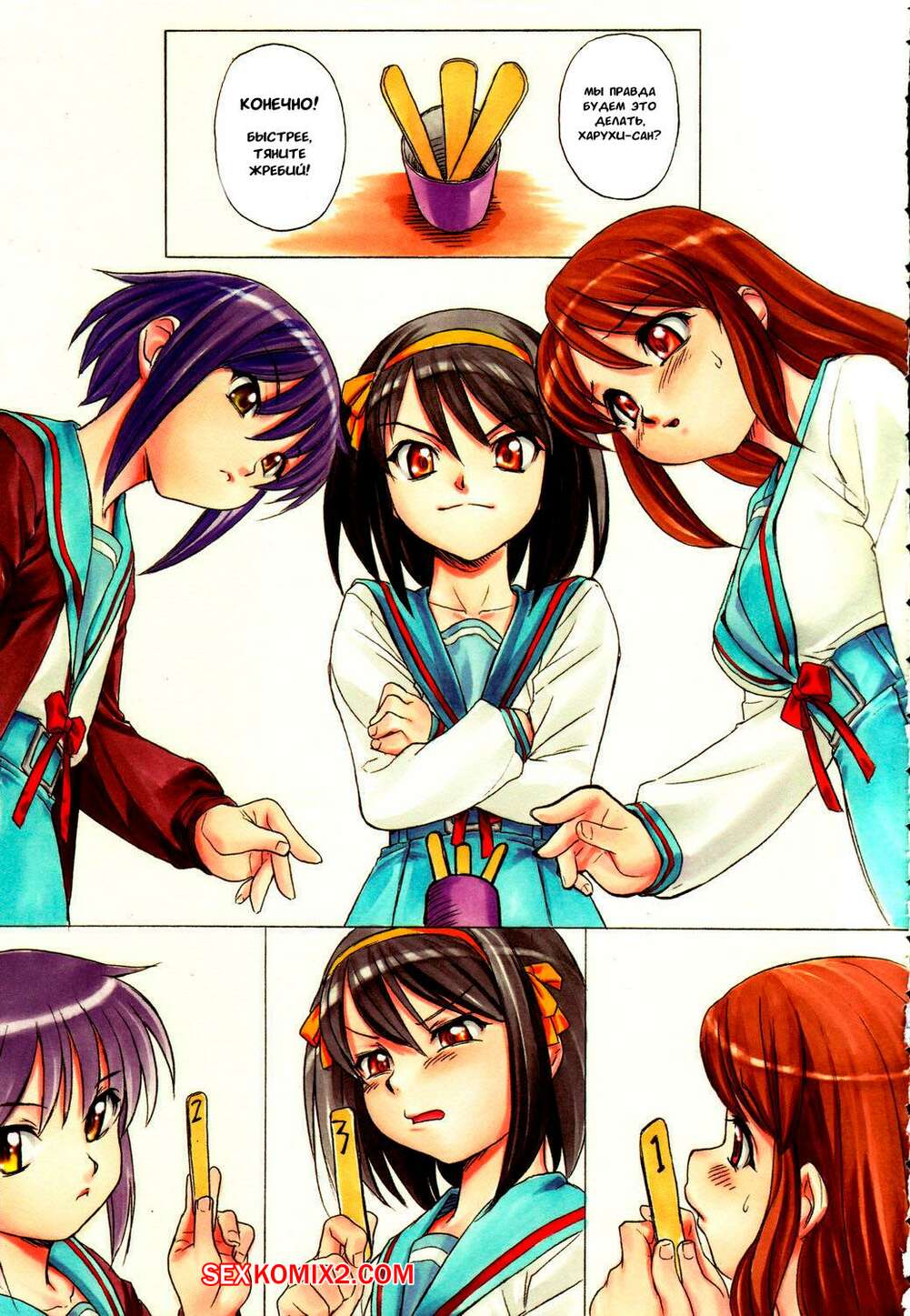 Порно комикс Suzumiya Haruhi no Yuutsu. Жеребьевка. Drawing Lots. Nishitsuki Tsutomu Горячие сисястые подруги были очень возбуждены и решили повеселиться со своим дружком. Они связали его на стуле и стали сосать хуй парня, после чего дали ему себя хорошенько выебать.