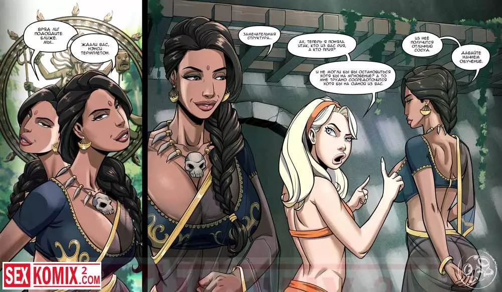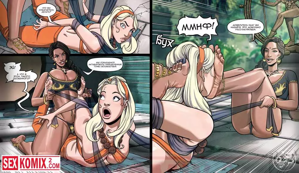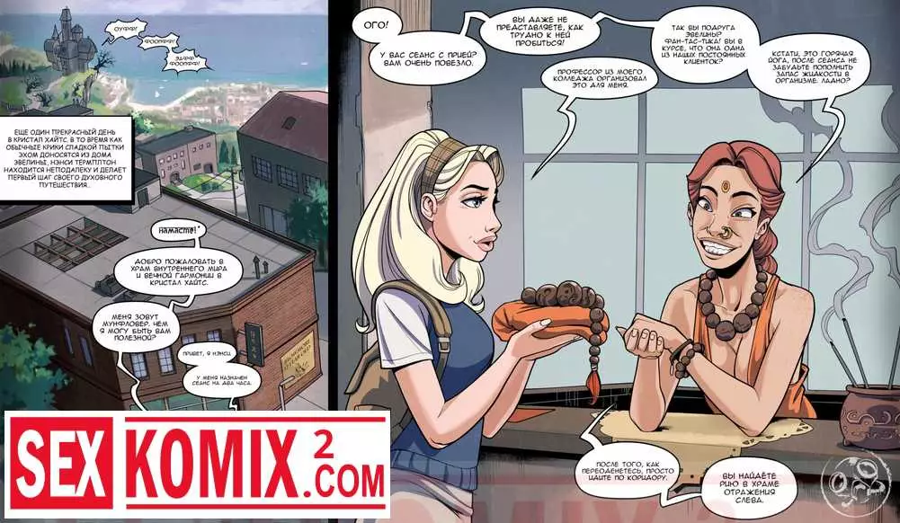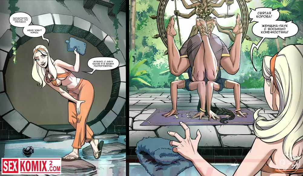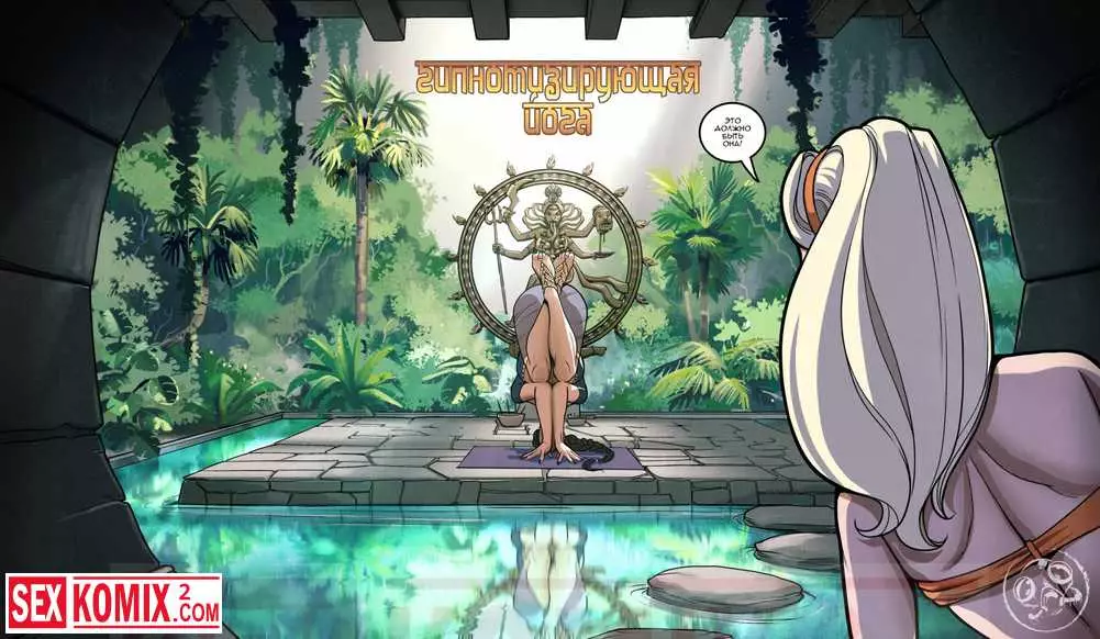 Порно комикс Гипнотизирующая йога. Блондинка пришла в магический магазин за снадобьем и увидела двух женщин близнецов. Они занимались йогой.