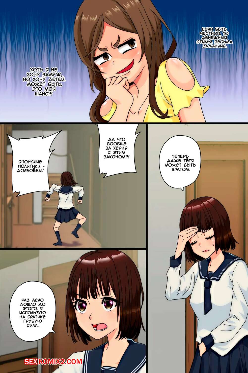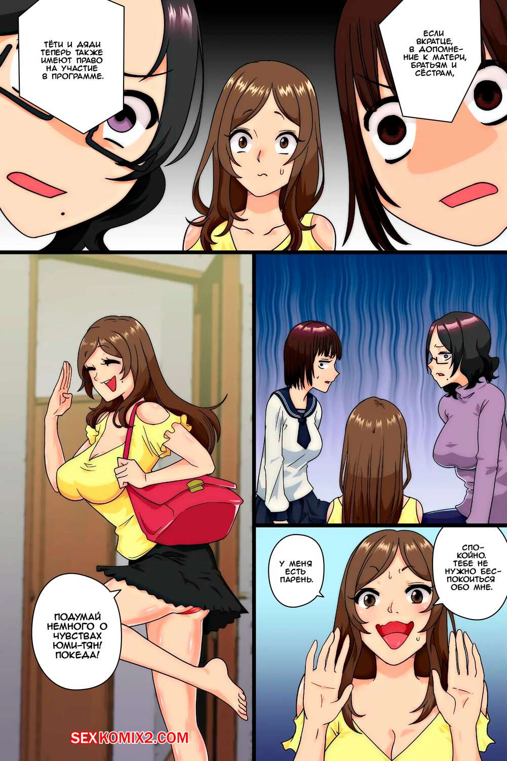 Порно комикс Моя мать, сестра и тётя каждый день приходят за моим членом. mc Горячие красотки обожают трахаться, поэтому они постоянно приходят в комнату к молодому парню. Красотки раздеваются перед ним и сосут его большой хуй, после чего дают ему себя выебать и кончить в них.