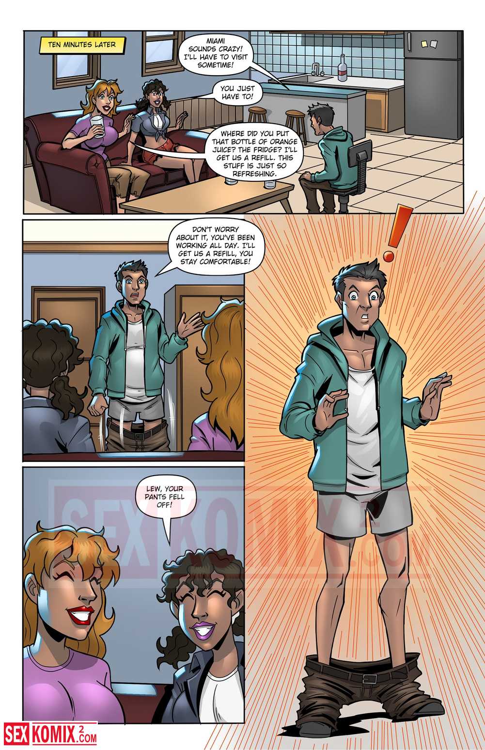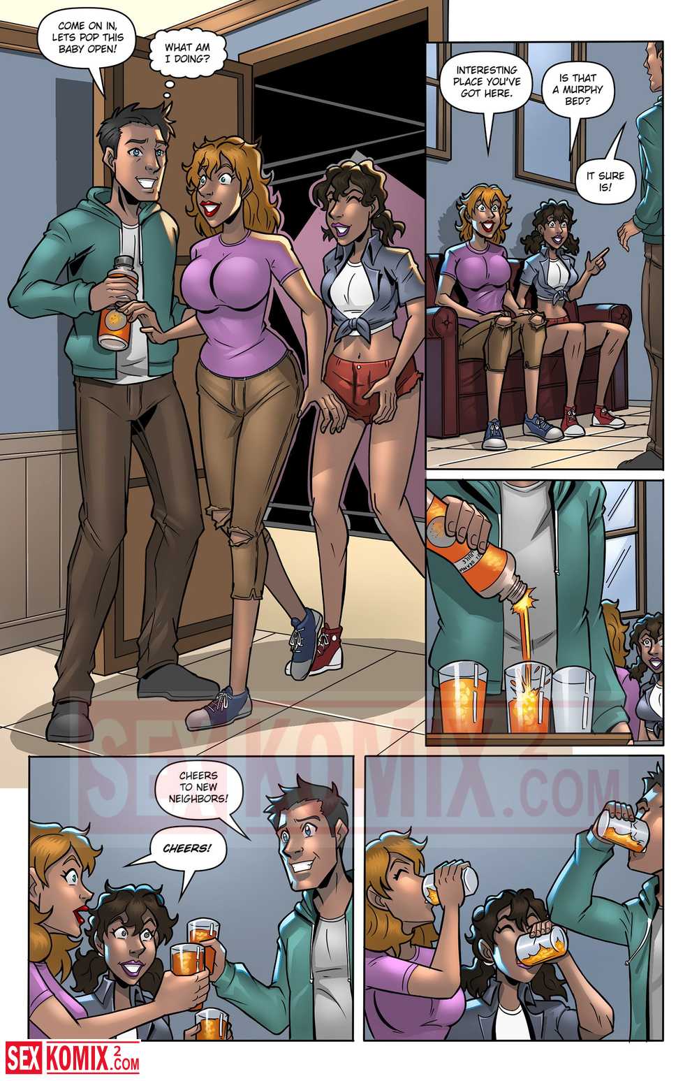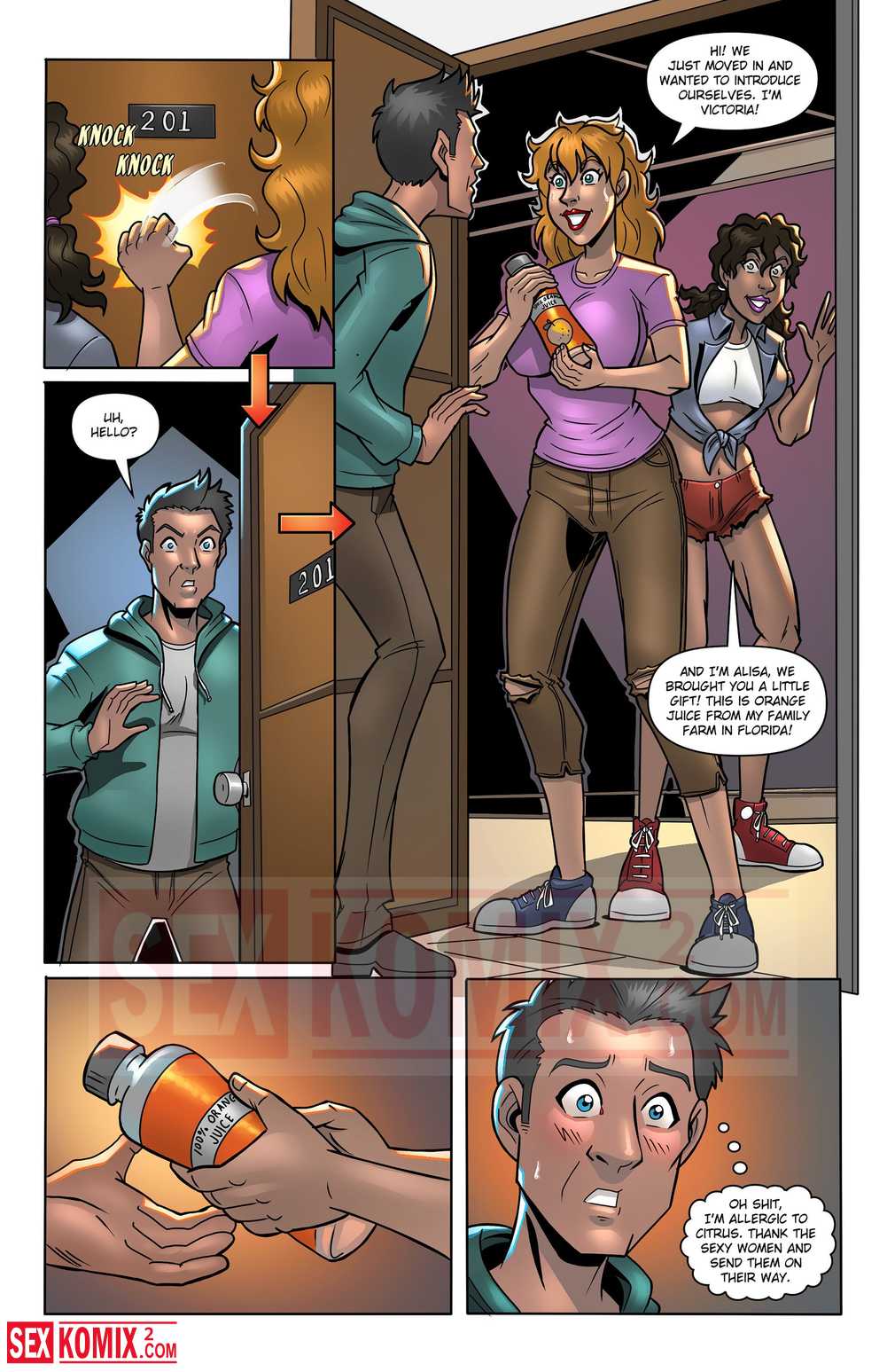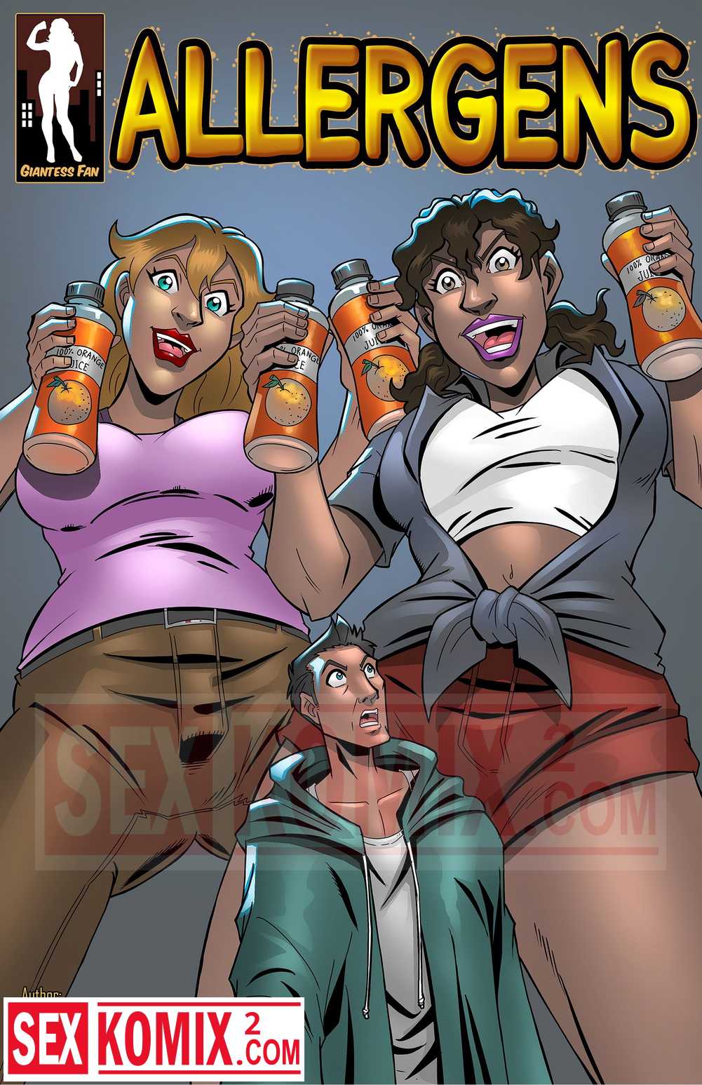 Порно комикс Аллергия. Английский. Две подруги пришли к парню, они выпили молока и стали больше. Их сиськи также увеличились, и парень захотел с ними секса.