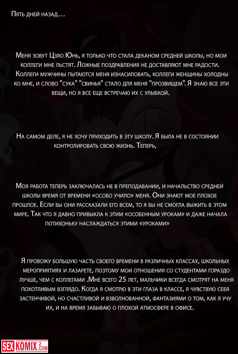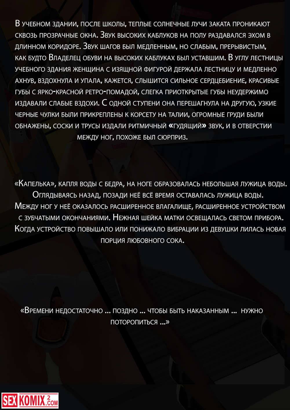 Порно комикс Зияющая школа. Часть 1. В учебном корпусе, после школы, в лучах тёплого солнца. Звук высоких каблуков по полу эхом разнесся по длинному коридору. Шаги были медленными и слабыми, прерывистыми, так как она устала.