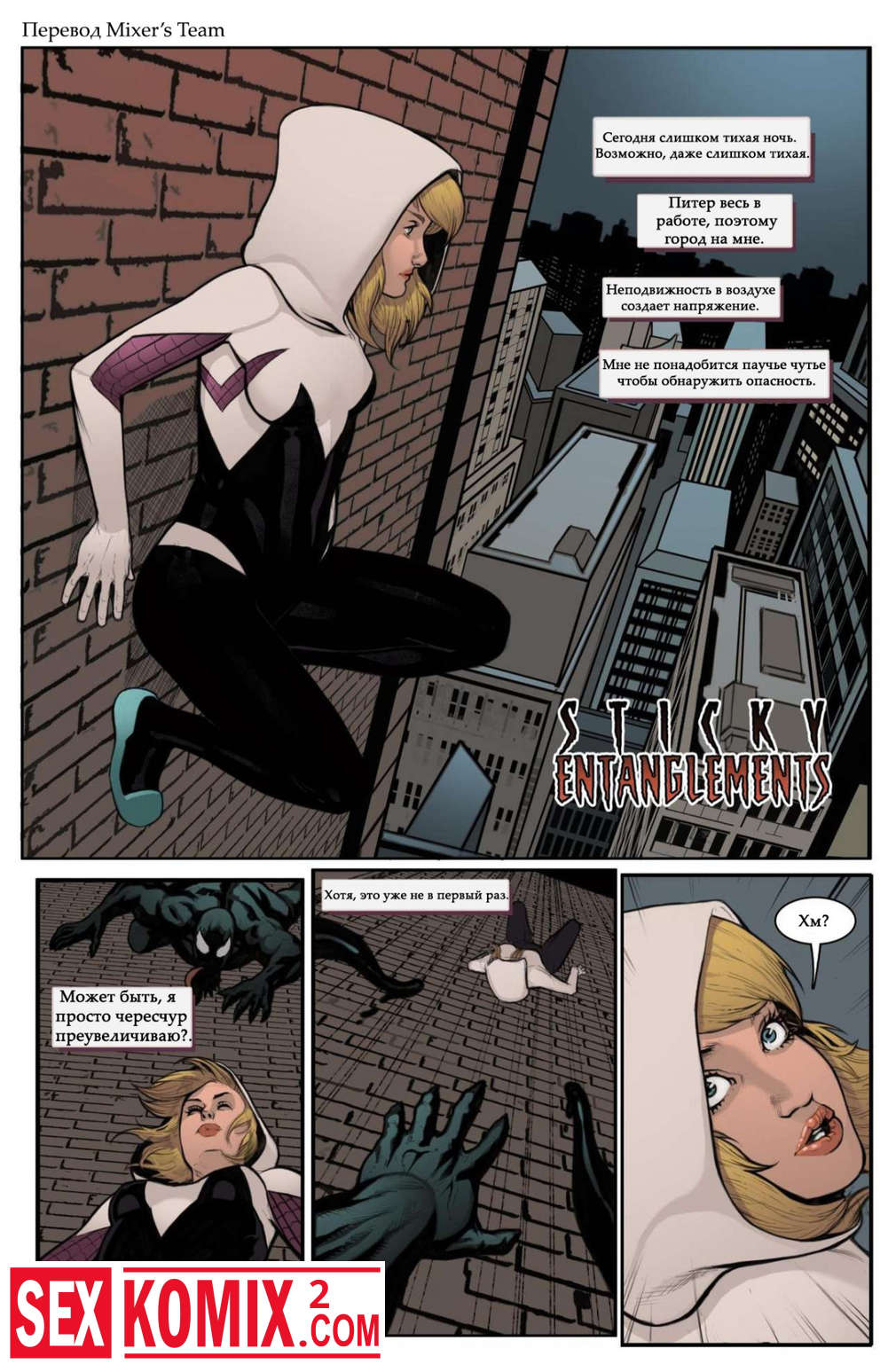 Порно комикс Липкие сплетения. Веном схватил Гвен и связал её, он трахнул красотку в рот. Но оказалось это всего лишь её фантазия.