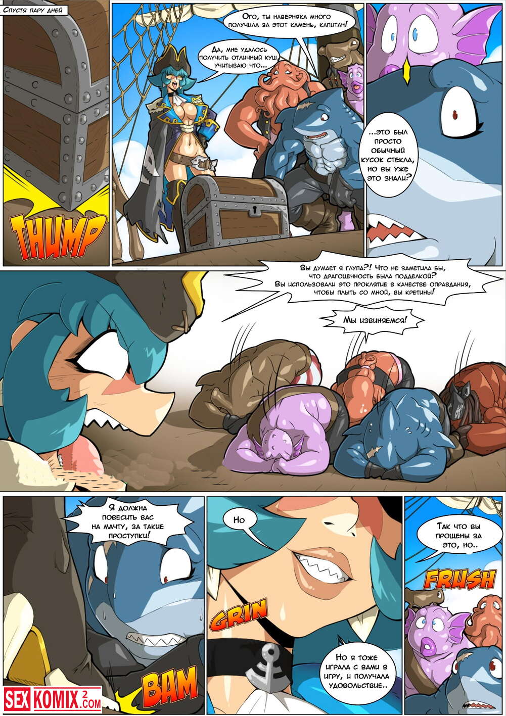 Порно комикс Капитан Баракуда. В команде пиратов Капитал девушка и она не случайно выбрала такую жизнь. Ей мало одного члена, нужна вся её команда.