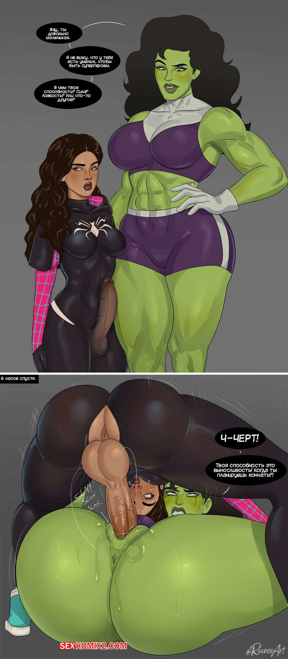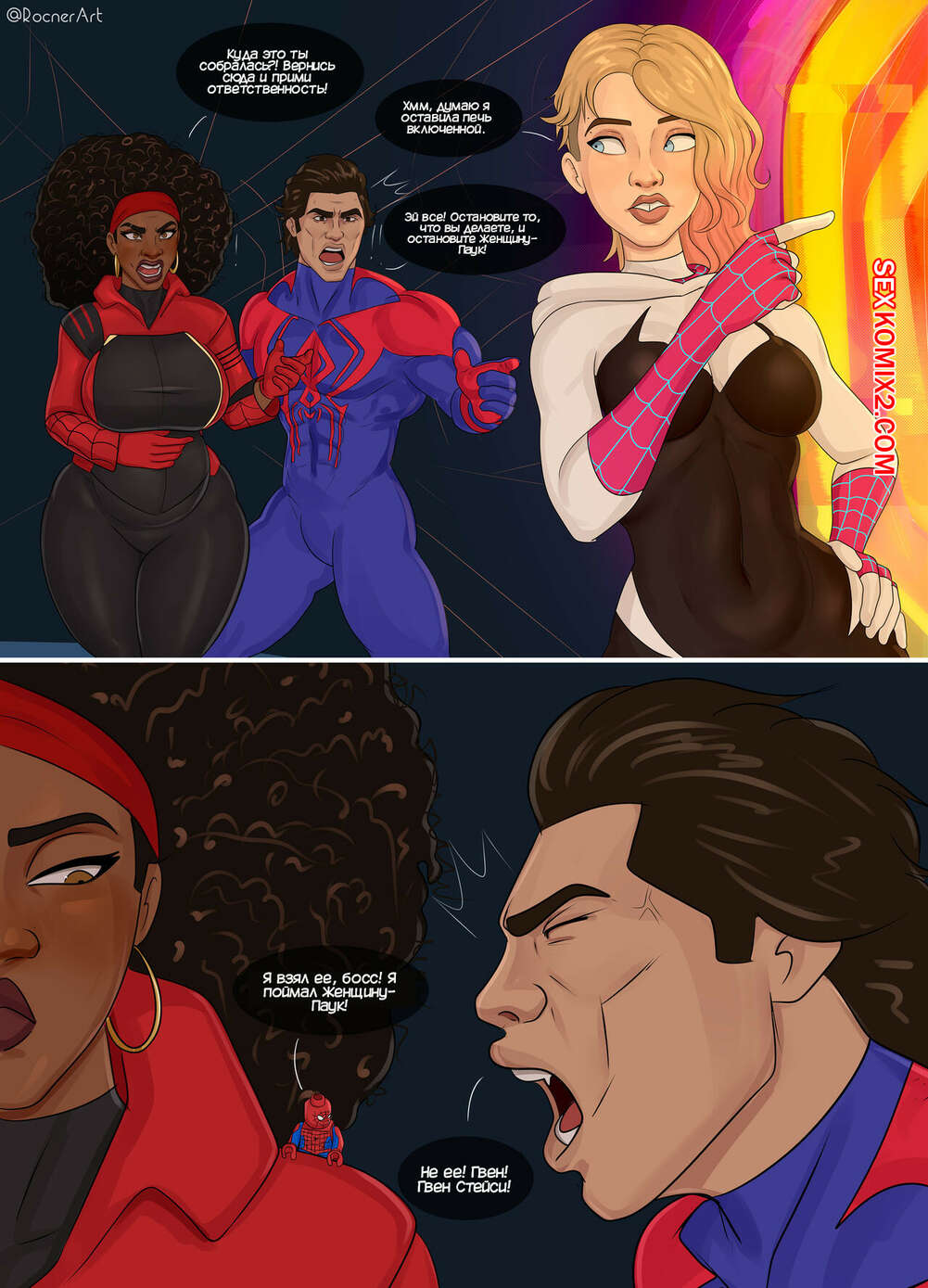 Порно комикс Гвен. Гвен Паук. Spider Gwen. Rocner Горячая блондинка Гвен пришла в гости к Майлзу. Увидев ее, мамка парня отправила его в магазин, чтобы остаться с юной девушкой наедине. Она разделась и стала сосать ее большой член, после чего дала ей себя выебать.