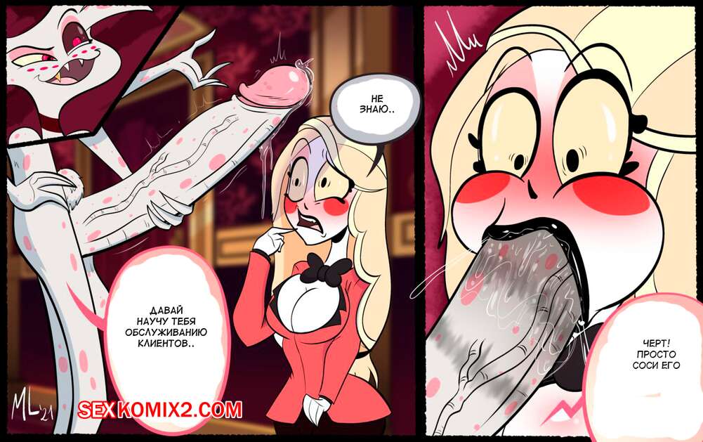 Порно комикс Отель Хазбин. Чарли и Энджел Даст. Charlie x Angel Dust. Ameizing Lewds Сексуальная брюнетка с большим хуем была очень возбуждена и решила повеселиться с подругой блондинкой. Она раздела ее и дала ей отсосать свой большой хуй, после чего хорошенько ее выебала.