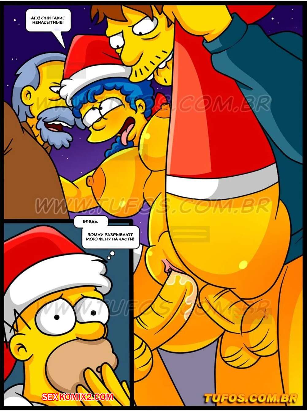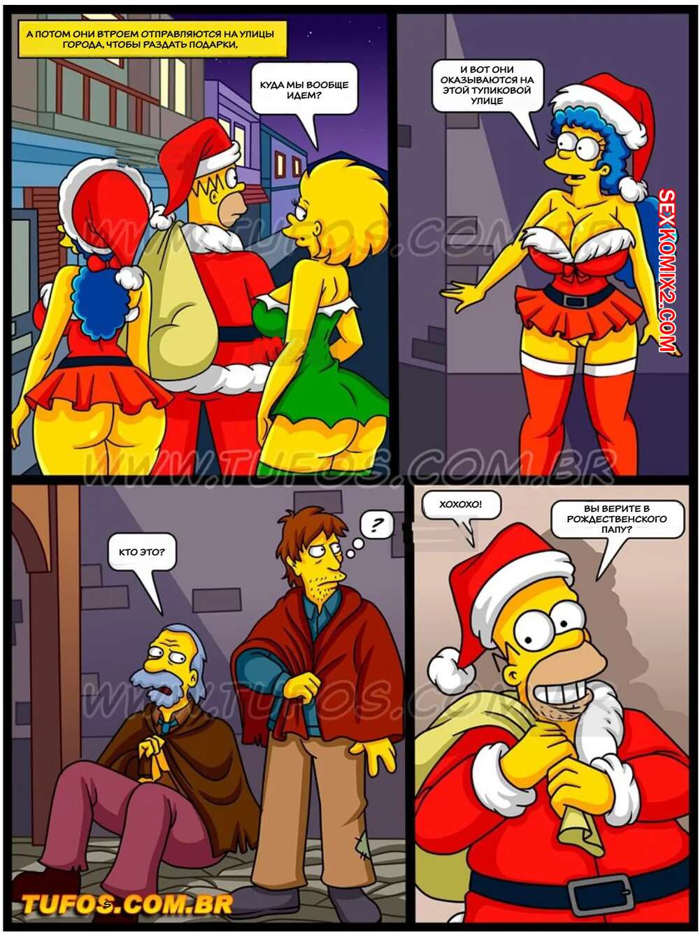 Порно комикс Симпсоны. Часть 59. Os Simptoons. Tufos Мардж с дочкой решил устроить рождественский подарок бездомным парням. Они отправились к ним в переулок и стали сосать большие хуи парней, после чего дали им выебать себя во все дырочки.