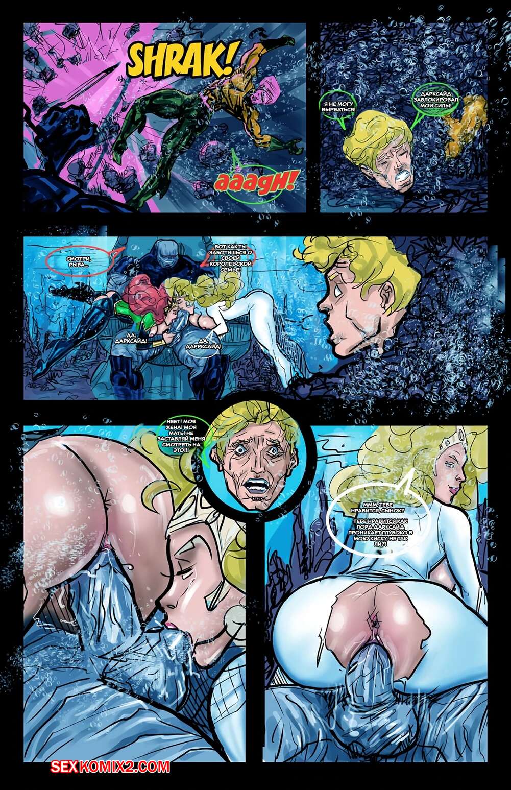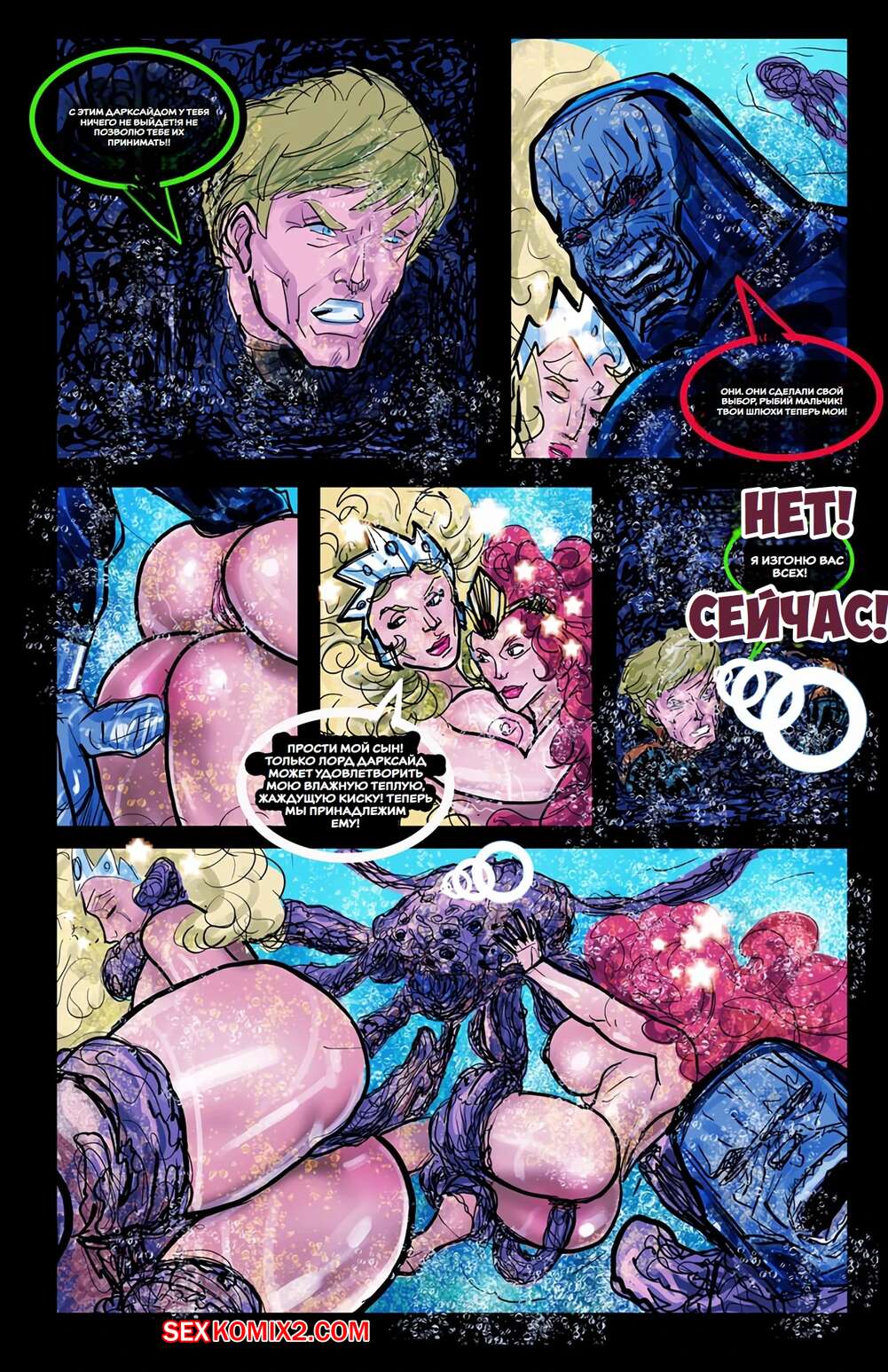 Порно комикс Лига справедливости. Темные глубины. Dark Depths. SuperPoser. Дарксайд напал на Атлантиду, где решил повеселиться с двумя горячими красотками. Он раздел их и дал им отсосать свой большой хуй, после чего хорошенько выебал их пизденки.