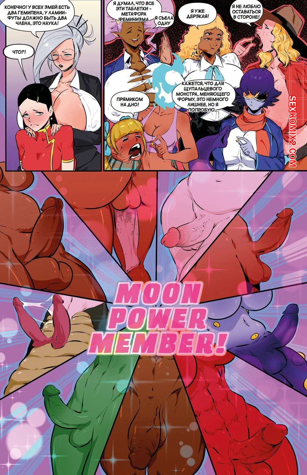 Порно комикс Академия девушек монстров. Часть 25. Monster Girl Academy. Worky Zark Горячие красотки получили себе член и решили решили повеселиться со своим дружком. Они все разделись и стали ласкать друг друга, после чего парень стал отсасывать члены подруг.