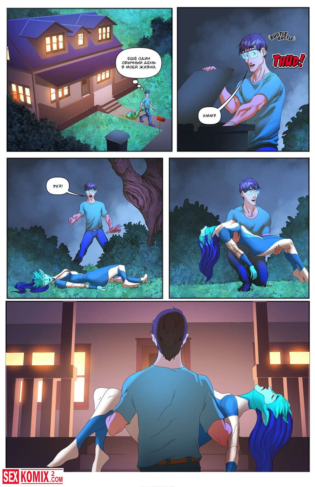 Порно комикс Чужие желания. На заднем дворе дома раздался какой-то хлопок и парень пошел проверить, что там. Это была девушка пришелец с шикарным телом и большими сиськами.