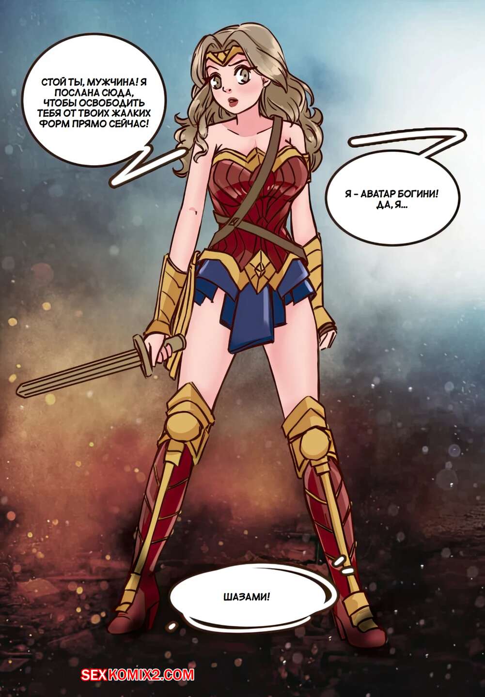 Порно комикс Чудо Женщина. Wonder Woman. meowwithme Молодой парень прошел обучение и смог произнести заклинание. С ним стали твориться невероятные изменения и вскоре парень превратился в сексуальную красотку Чудо Женщину.