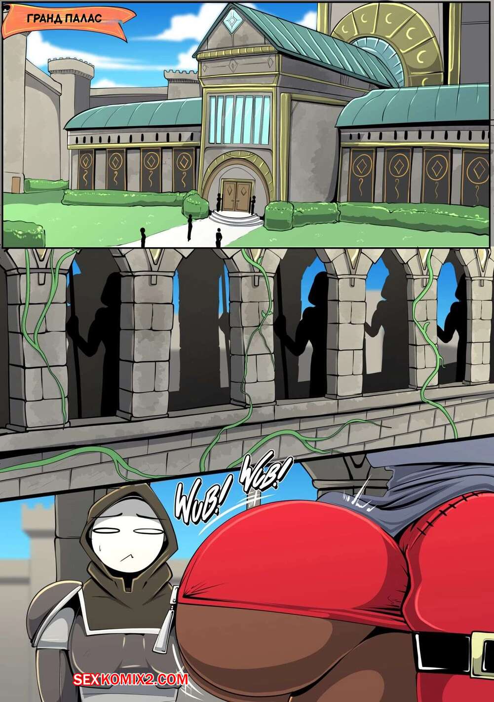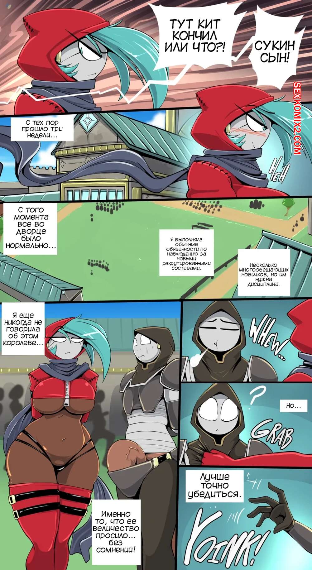 Порно комикс Королевская гвардия. The Queens Guard. Vale City Горячая сисястая красотка обнаружила, что новенький парень из стражи не носит форму и светит своим огромным толстым членом. Девушка решила повеселиться с ним и стала его соблазнять своими заигрываниями.