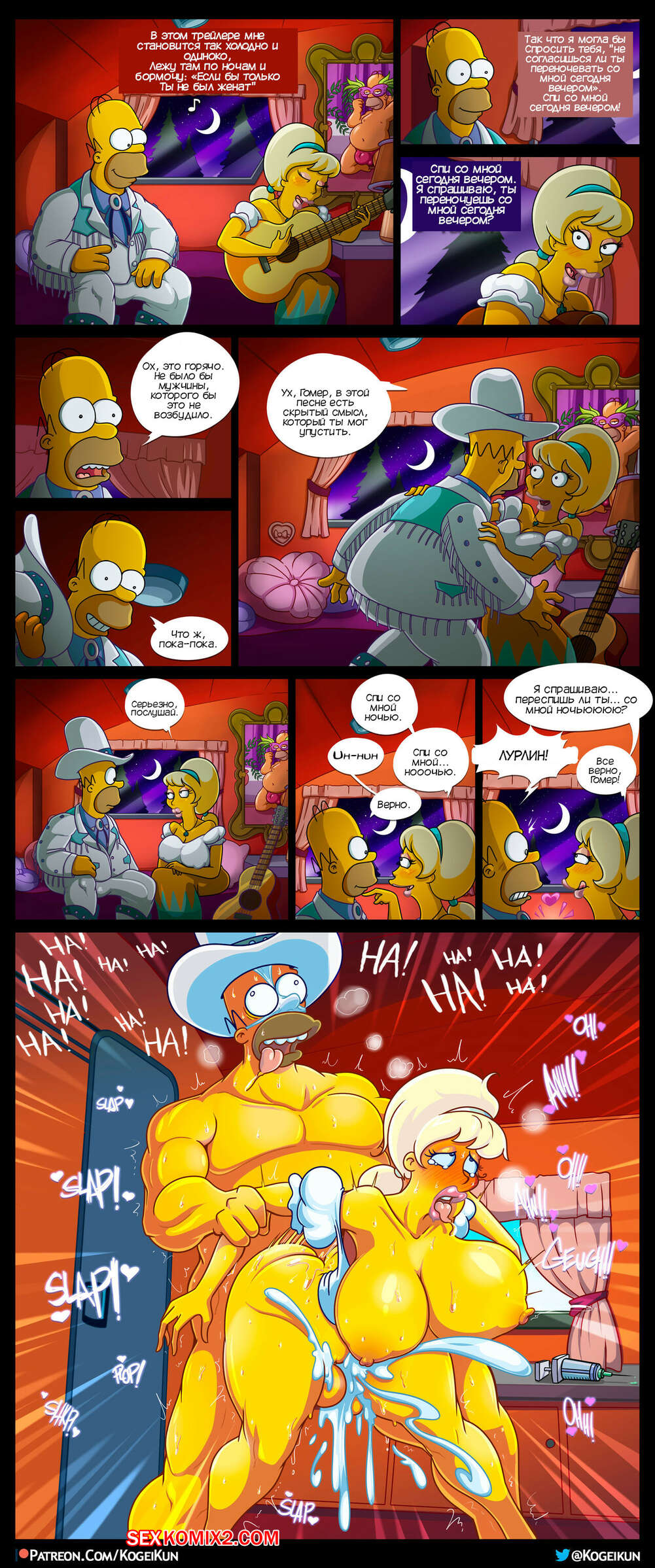 Порно комикс Симпсоны. Лурлин Лампкин. Lurleen Lumpkin. Kogeikun. Горячая блондинка милфа осталась наедине с Гомером и стала петь ему песню, желая соблазнить друга. Вскоре Гомер наконец все понял и как следует выебал пизденку милфы.
