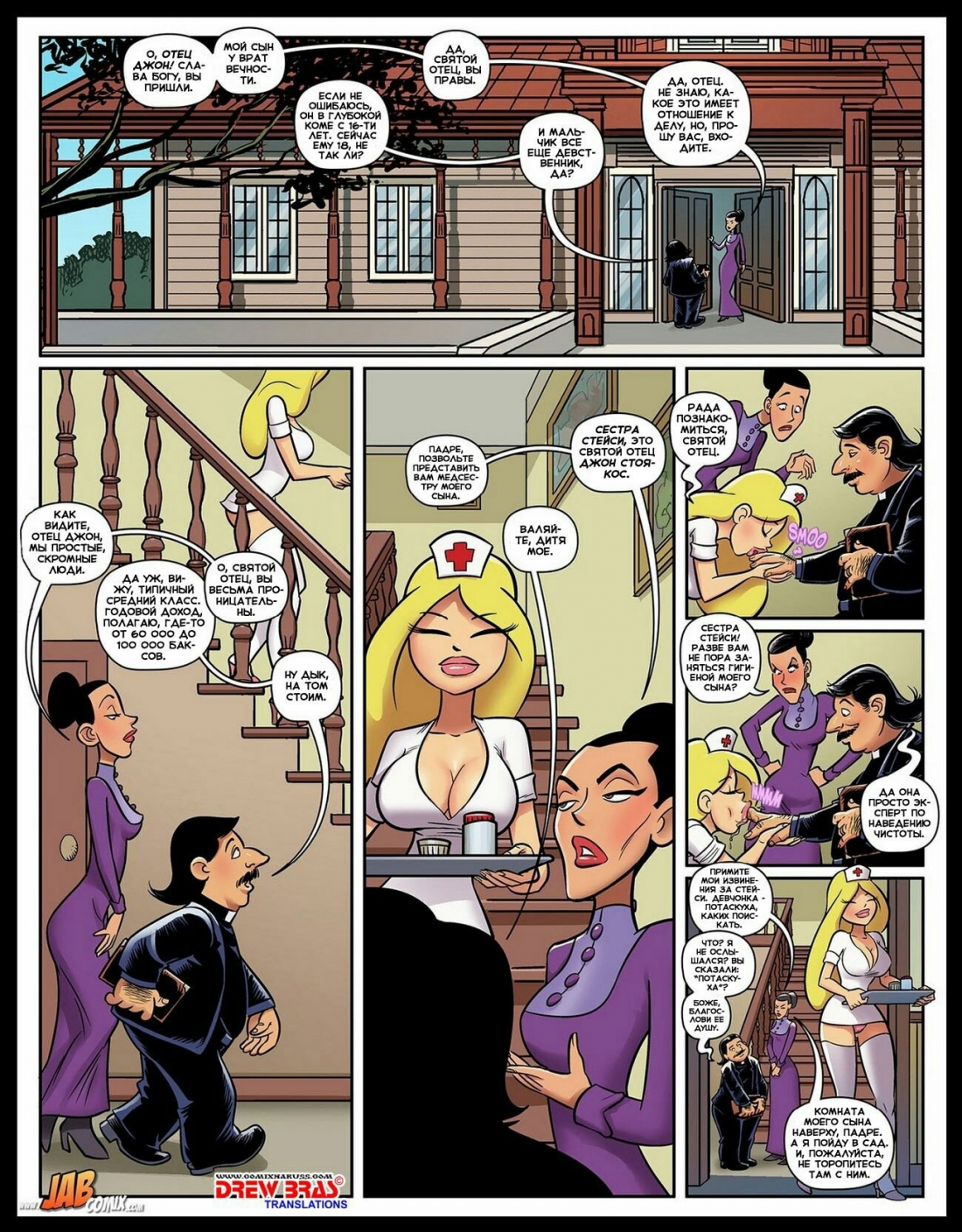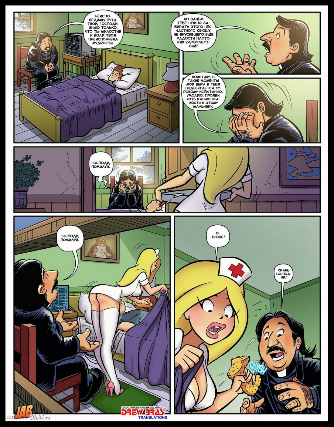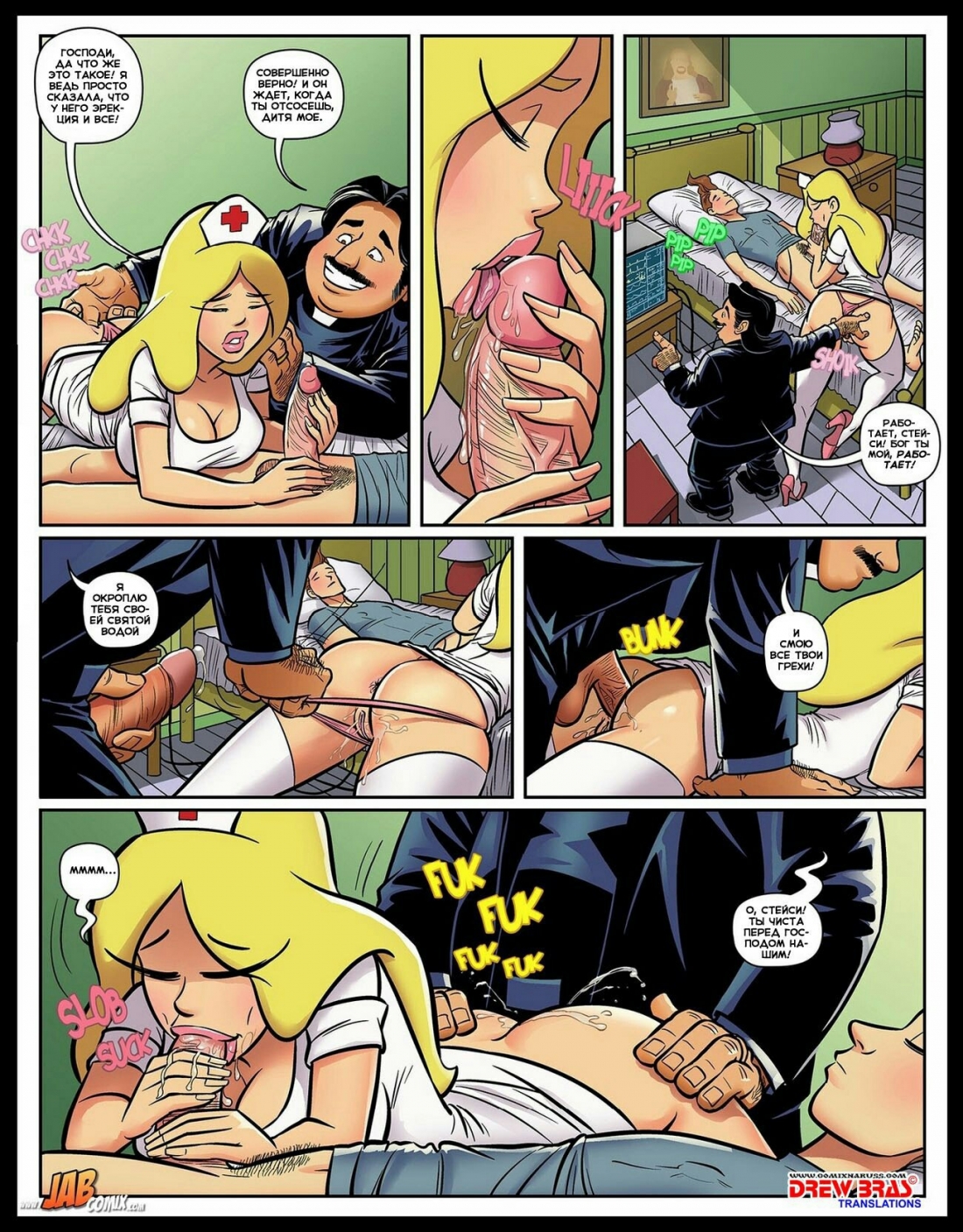 Порно комиксы 2018 «Медсестра Стейси (Nurse Stacy)». Этот комикс 18+ о медсестре, она очень сексуальная девушка и все сходят по ней с ума и хотят трахнуть. Не остался в стороне и пастырь местной церкви, он позвал девушке к своему пациенты, чтобы она помогла с его лечением. Парень лежал в коме уже несколько недель, но когда Стейси пришла и начала его мыть, у него встал член, все были в шоке, он отреагировал на неё. Это нельзя было просто так оставить и пастырь девушку отсосать член, так как возможно это поможет вернуть паренька из комы. Медсестра не долго думаю начала обрабатывать пациента своим ротиком…