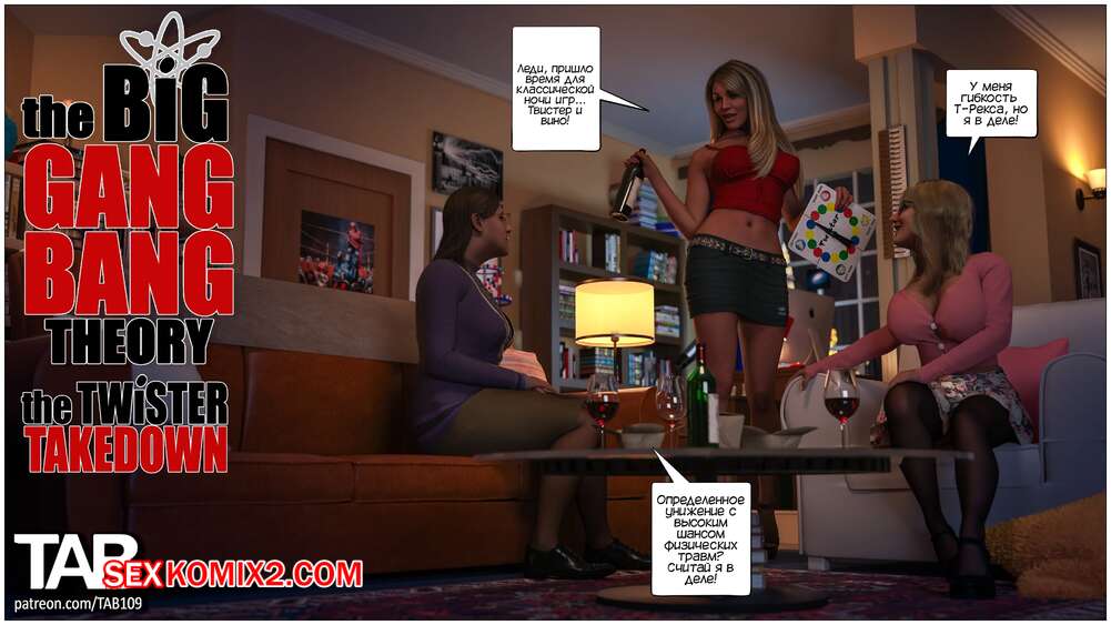 Порно комикс Теория Большого Ганг Бэнга. Уничтожение Твистера. The Big Gang Bang Theory. Tab109. Горячие подруги собрались вместе, чтобы поиграть в твистер и выпить вина. Пенни сильно перебрала, поэтому подруги решили наказать девушку за то, что она ведет себя как сучка.
