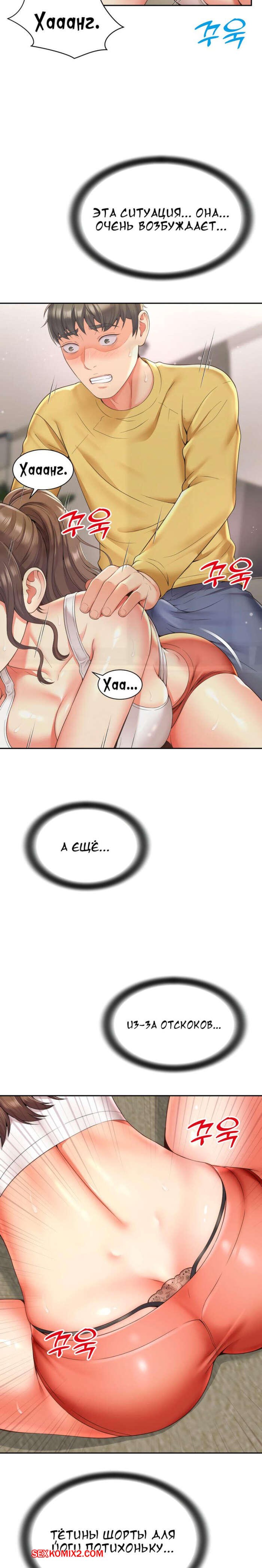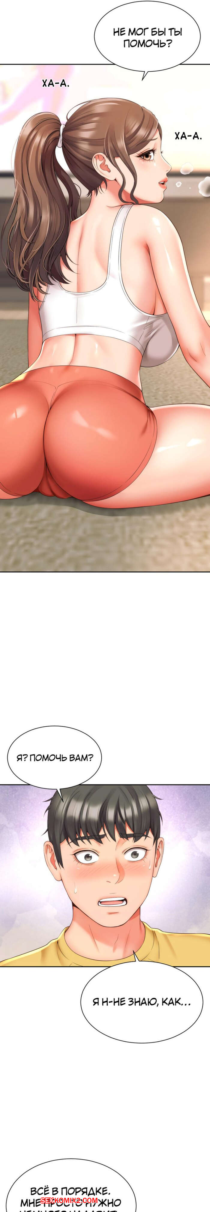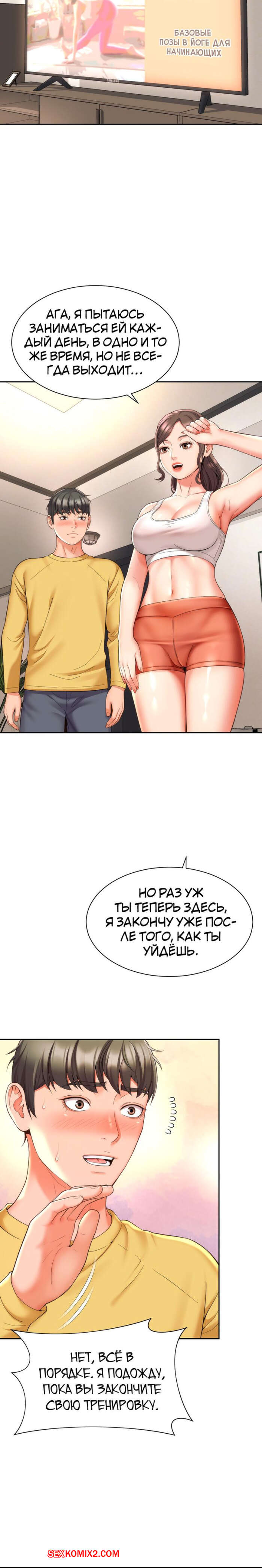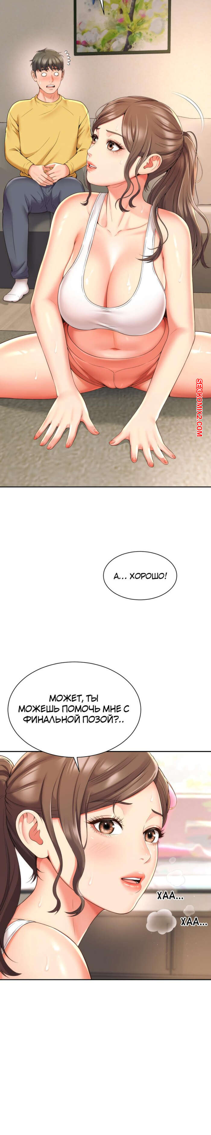 Порно комикс Его мама моя. Часть 1 и 2 и 3. Friend Mom and friend fuck Горячая милфа занималась йогой и попросила молодого парня ей помочь. Он пристроился сзади к девушке и стал на нее давить, от чего у него встал хуй и он представил, как ебет пизденку девушки.