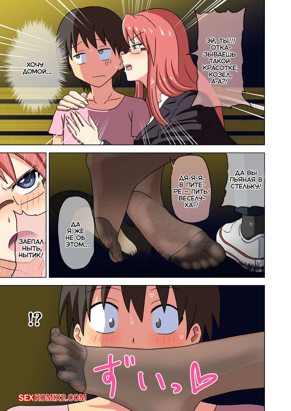 Порно комикс История футфетишиста. Часть 36. Nush Парень ночью возвращался домой по парку и встретил двух горячих пьяных девушек. Они предложили ему повеселиться и стали дрочить хуй парня своими ножками, помогая ему кончить.