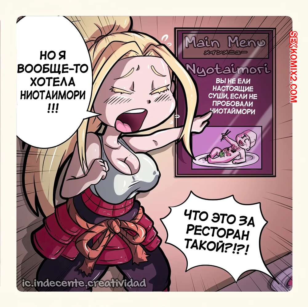 Порно комикс Суши. Zom 100. Indecente Creatividad. Горячая блондинка отправилась в суши бар, желая получить ниотаимори, но в итоге осталась разочарована. Девушка решила показать как следует подавать суши, поэтому разделась и стала кормить посетителей сушами со своего шикарного тела.