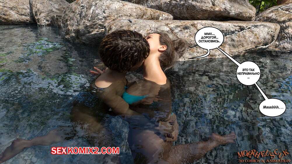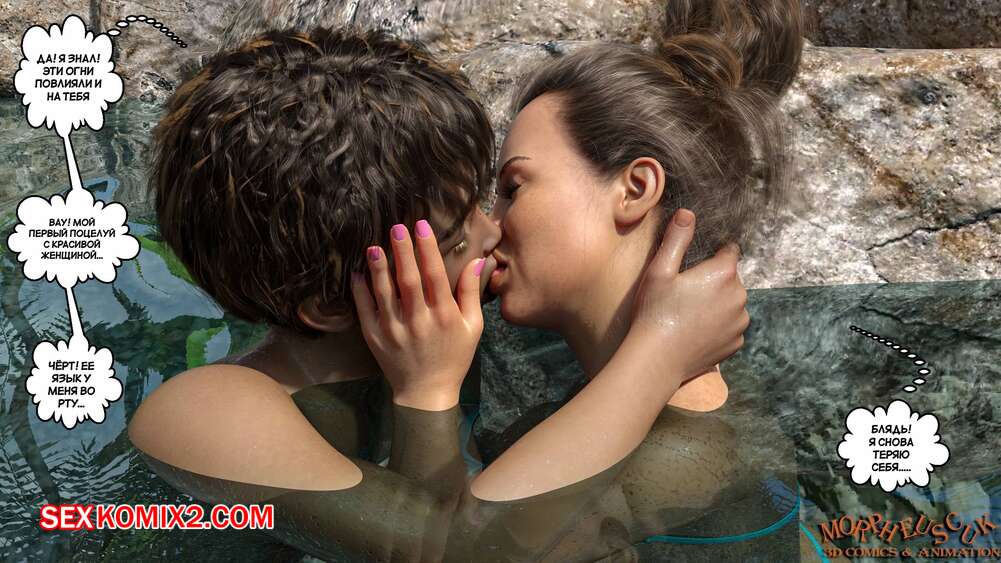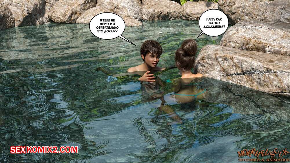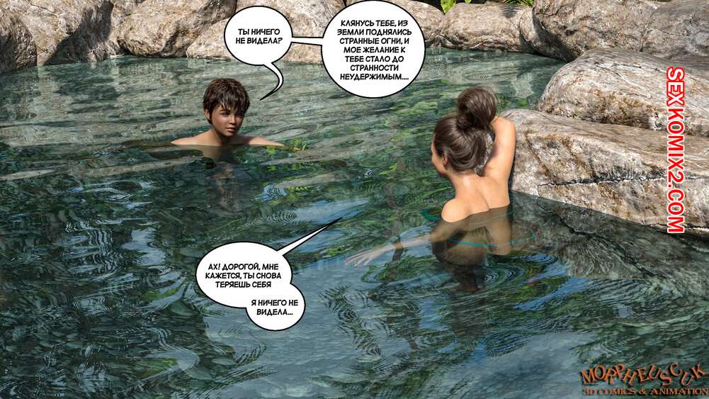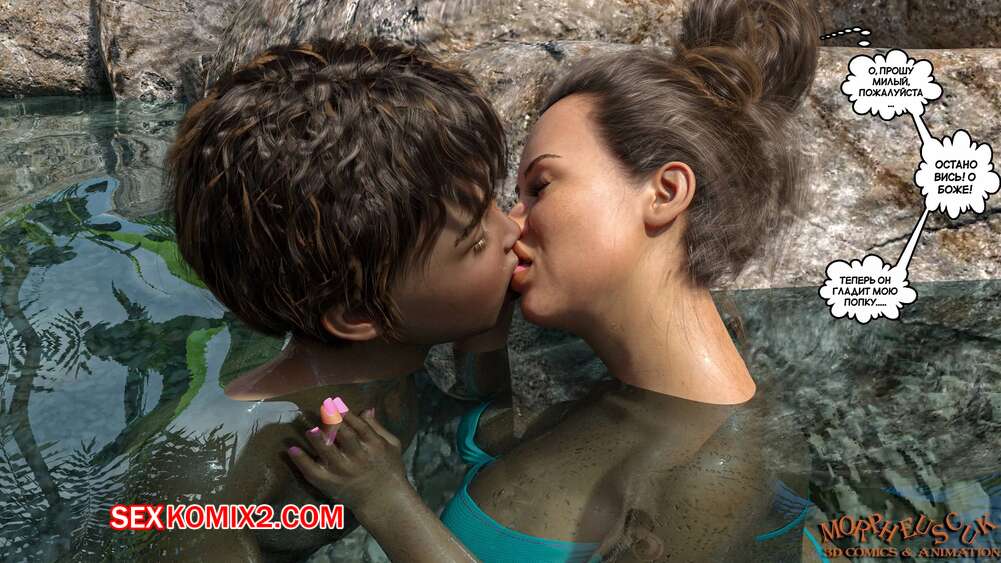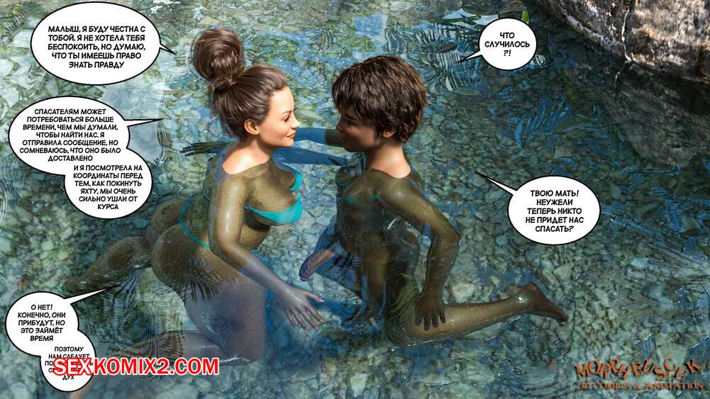 Порно комикс Затерянный остров. Часть 4. Lost Island. Morpheuscuk Во время купания парень очень возбудился от шикарного тела своей горячей мамочки рядом. Он стал ласкать большие сиськи милфы и тереться хуем между ними, после чего покрыл огромные сиськи и лицо мамочки спермой.