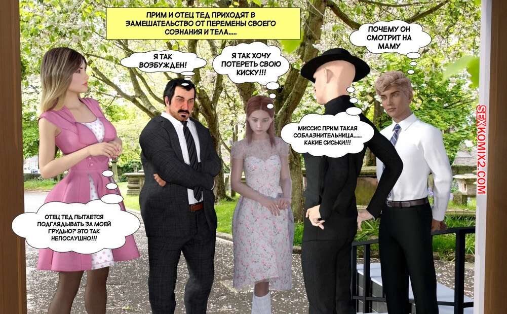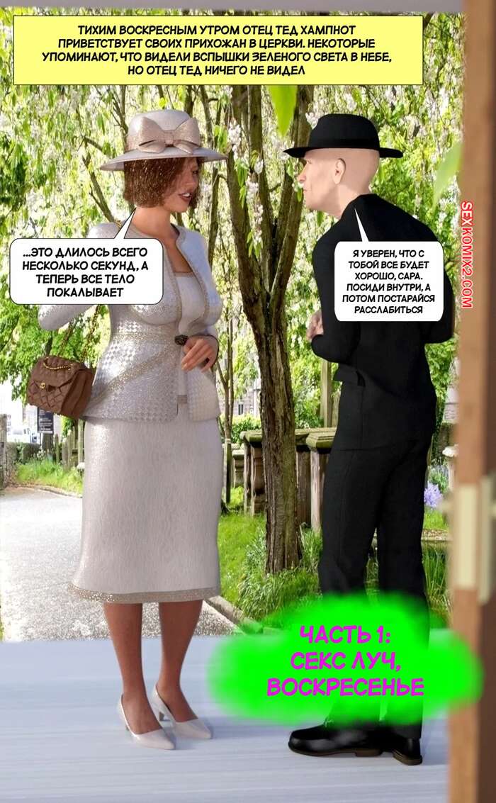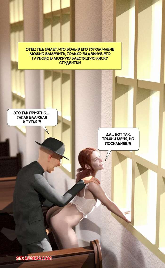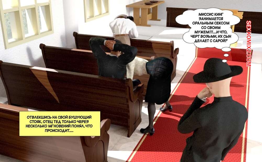 Порно комикс Секс луч с Марса. The Sex Ray from Mars. Resurgum2 Гости церкви подверглись воздействию секс луча с Марса, который возбудил всех людей. Красотки раздеваются и сосут большие хуи парней вокруг, после чего дают им себя выебать.