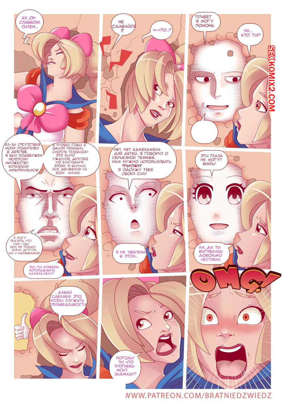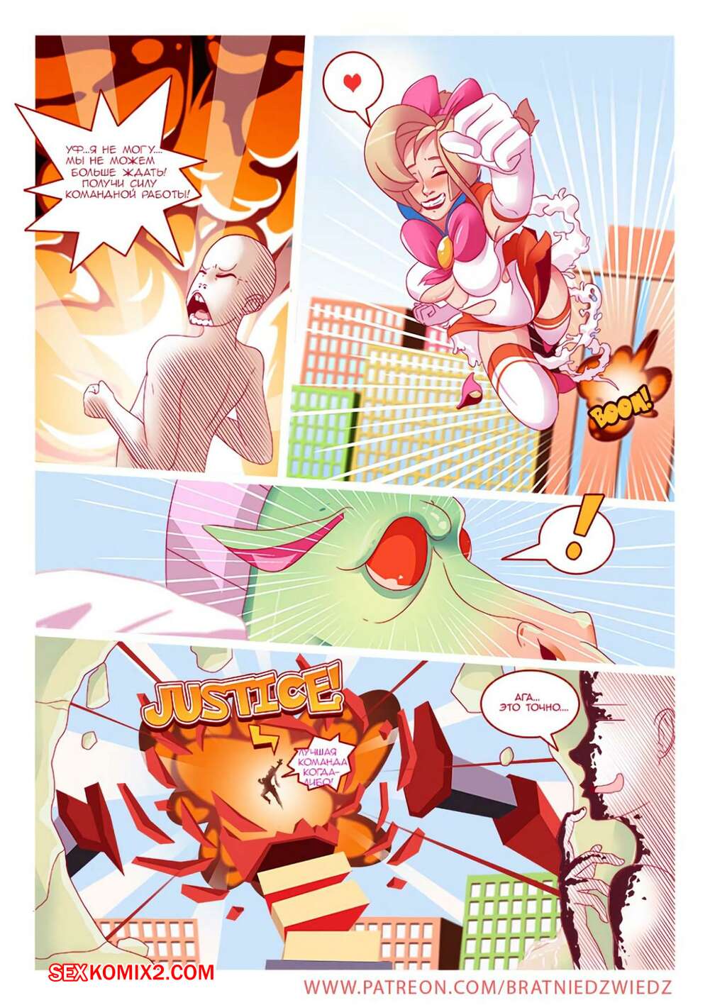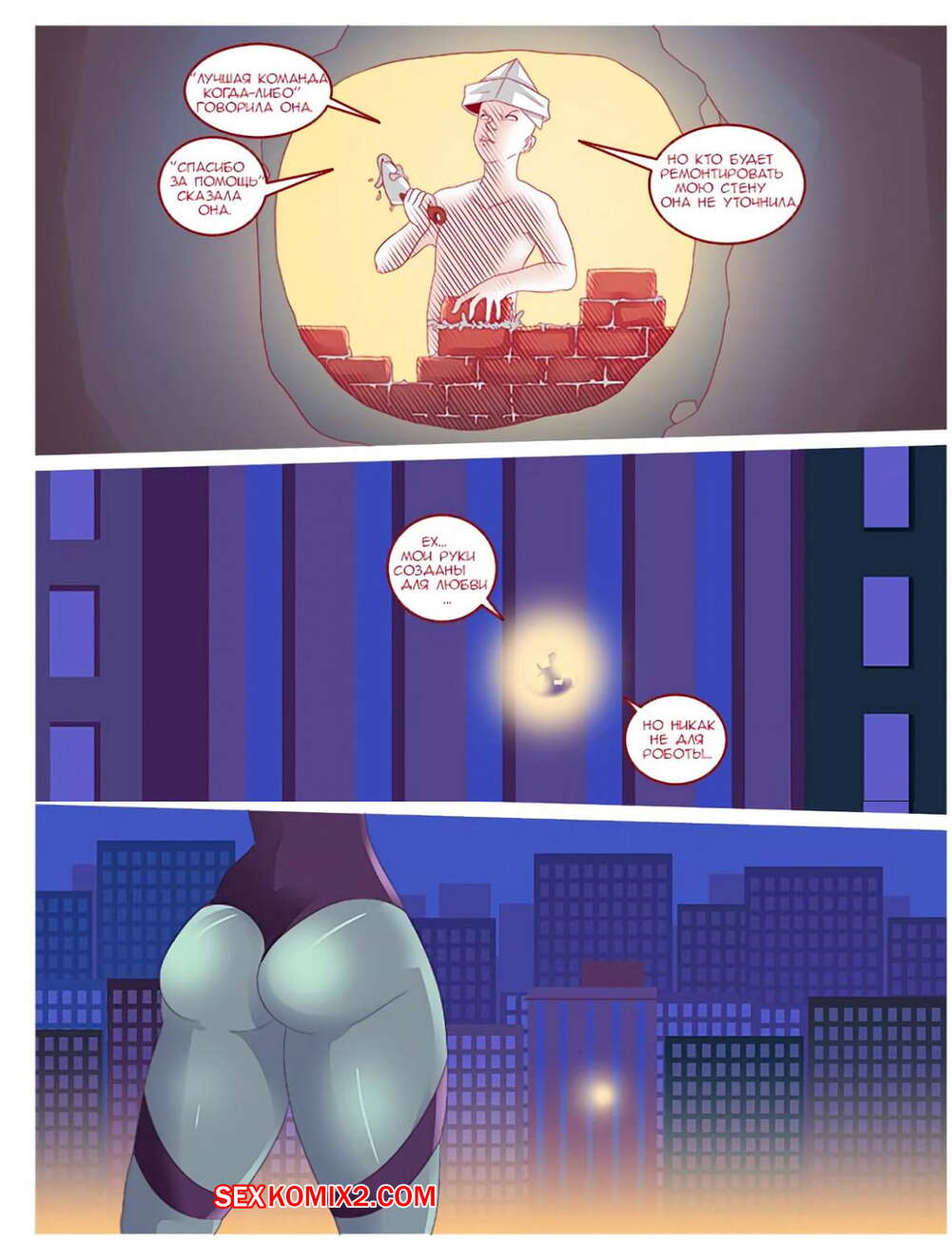 Порно комикс Справедливость восторжествует. Часть 2 На город напал огромный робот и на сражение с ним отправилась супергероиня. Робот был слишком силен и бросил девушку в дом, где она пробила щель в квартиру одного парня. Тот решил помочь красотке и решил поделиться с ней своей силой, выебав ее. Сначала она пыталась противиться, но вскоре ей все это понравилось и она испытала восторг.