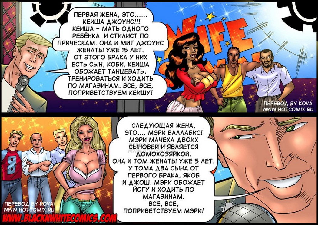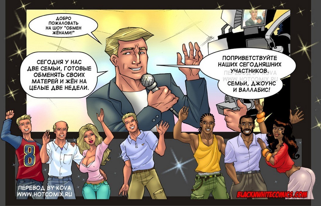 Порно комикс «Обмен женами». Это новое реалити-шоу, в котором на несколько дней мужья обмениваются своими женами, и за всеми событиями следит скрытая камера. В этот раз женами обменялись чернокожий парень из гетто и обеспеченный из дорогого района. Днём пока на них смотрят видео камеры они показывают бытовые проблемы и как герои с ними справляются, оказавшись в новых условиях. А ночь, когда все камеры выключены, участники проекта лежаться в одну кровать с чужими супругами. Вот тут та и начинается самое интересное.