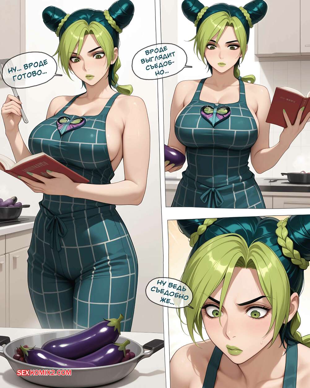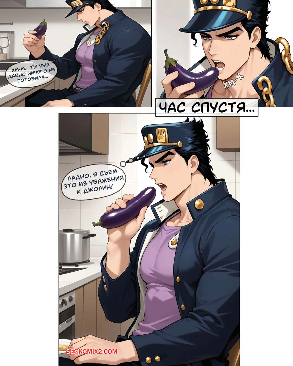 Порно комикс Невероятные Извращения Джо Джо. JoJos Bizarre Perversions. Artificalart Красотка приготовила баклажаны и угостила своего дружка, от чего он почувствовал сильное возбуждение. Девушка воспользовалась моментом и стала ласкать хуй своего дружка, после чего дала ему себя трахнуть и кончить в нее.