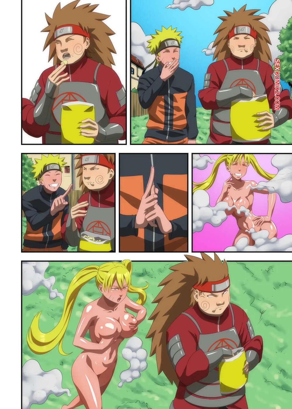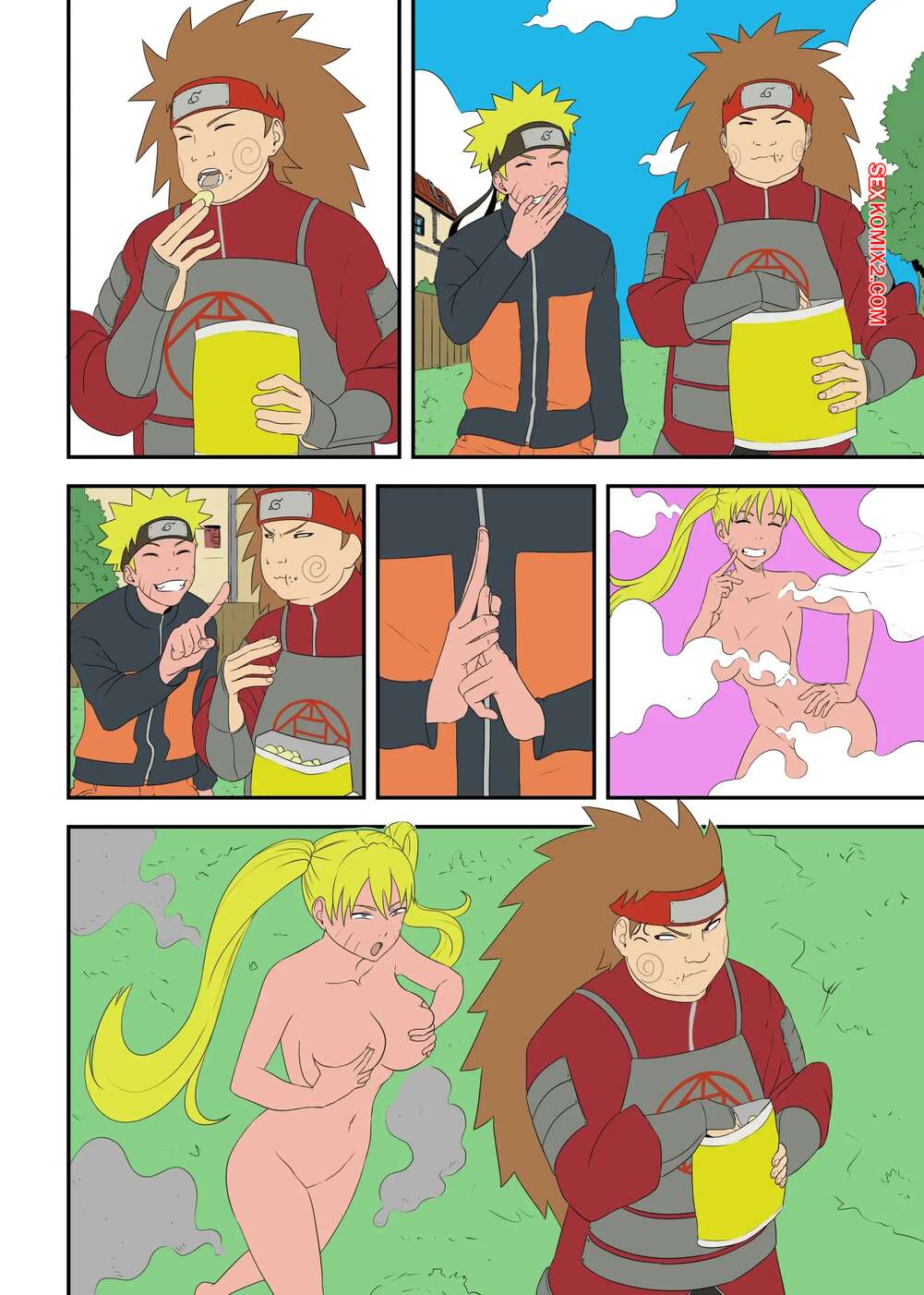 Порно комикс Наруто. Толстая шутка. Fat Joke. The 63rd Rule. Наруто превратился в сексуальную девушку, что ни капли не смутило его друга. Он поставил девушку на колени и дал ей отсостаь свой толстый член, после чего выебал пизденку блондиночки и кончил в нее.