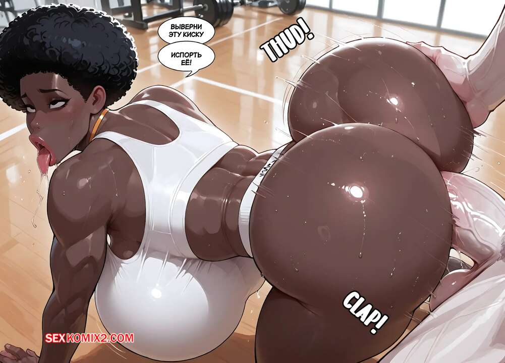 Порно комикс Тем временем, Марк. Meanwhile, Mark. Proxy Темнокожая красотка приходит на индивидуальные тренировки к Марку. Она замечает его большой стояк и отсасывает ему, стоя на коленях, после чего раздвигает ножки и дает себя выебать.