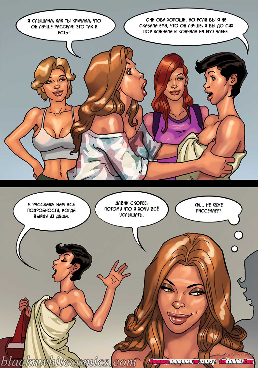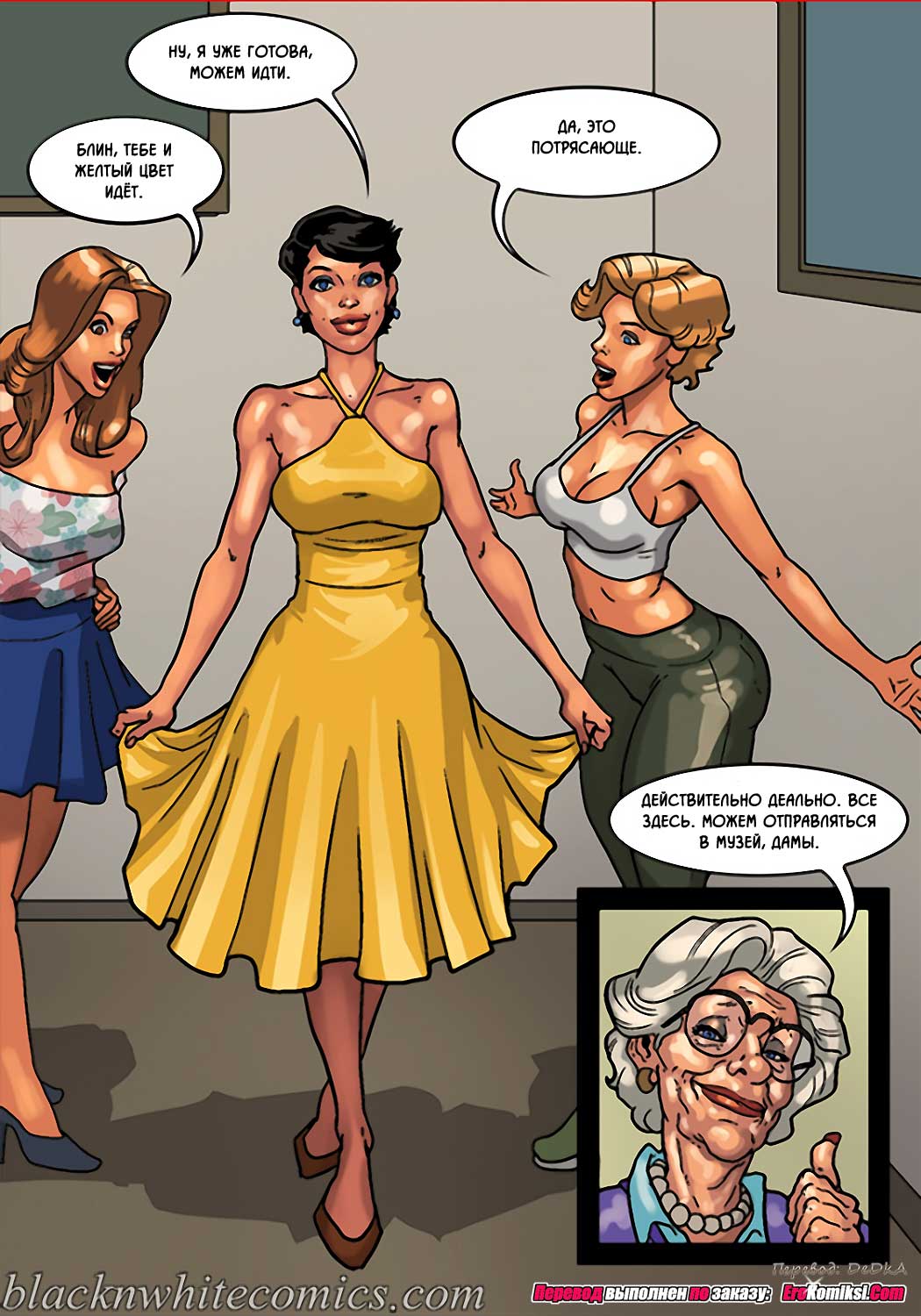 Порно комикс «Художественный кружок. Часть 2». В прошлой части комикса сексуальные художницы приглашали чернокожего парня, чтобы нарисовать его голое тело. Но они так сильно возбудились, что захотели заняться с ним сексом в чём он им не отказал и они славно потрахались все вместе. Теперь эти же художницы организовали выставку с картинами, на которых был изображён этот парень и они пригласили его посетить эту выставку, на которой девушки снова захотели отведать чёрного члена. Они принялись таскать бедного паренька в туалет по очереди и насаживаться на него своими мокрыми кисками.