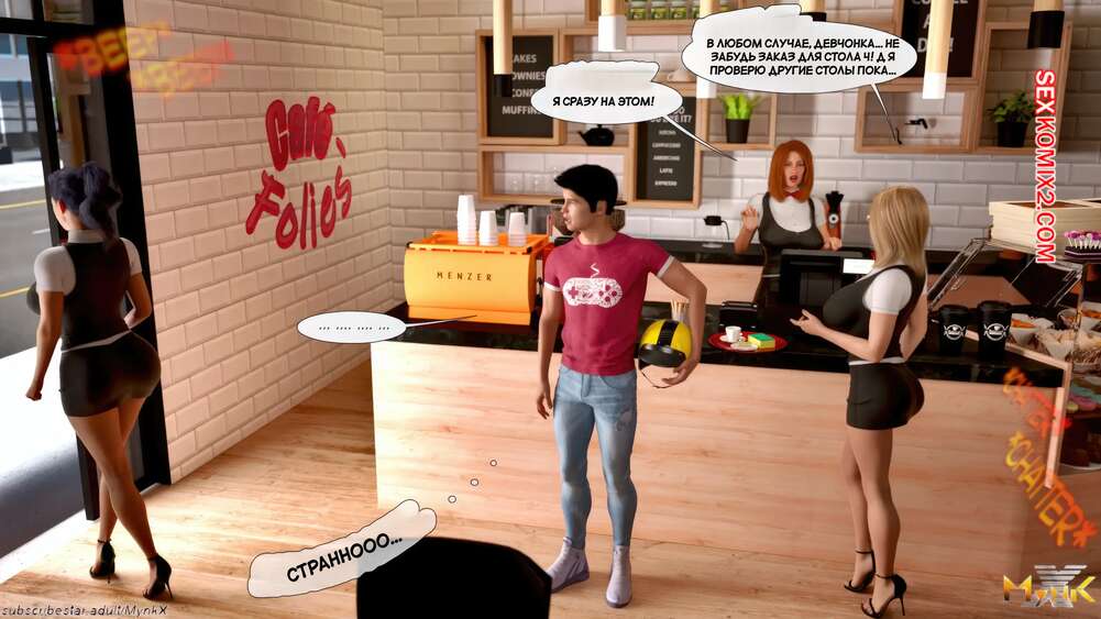 Порно комикс Кафе Фоли. Часть 11. Cafe Folies. Mynkx Парень возбудил красотку, лаская ее пизденку пальчиками, после чего поставил ее лицом к стене. Девушка раздвинула свои ножки и приняла в себя хуец парня, от чего они вместе получили удовольствие.