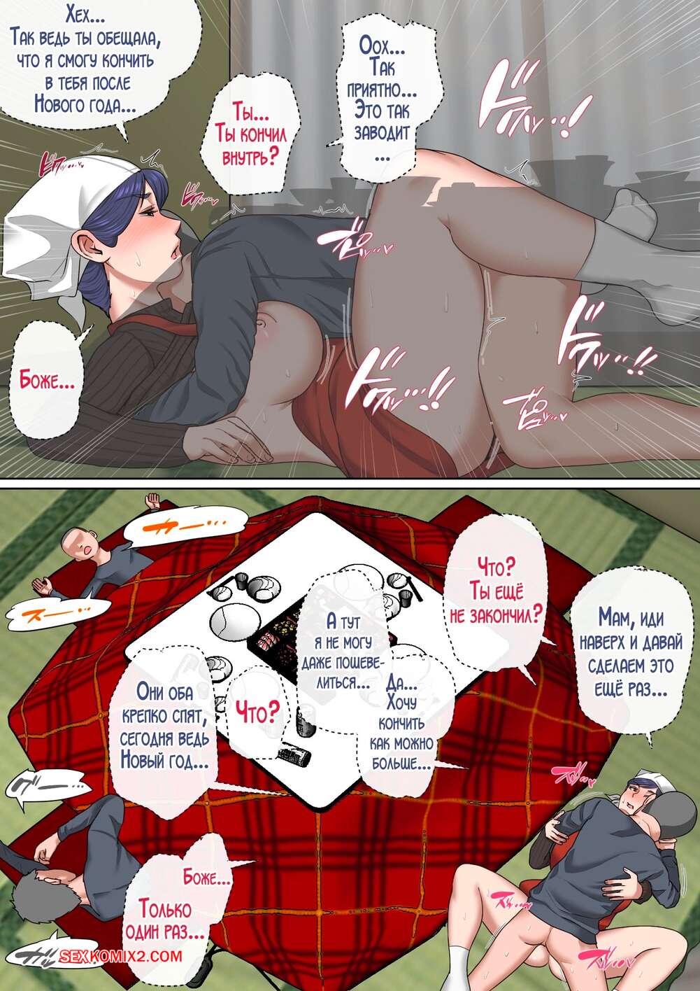 Порно комикс Встречаю Новый год вместе с мамой! Natsume Benkei Горячая милфа занималась домашними делами, но ее сын стал до нее домогаться, желая трахнуться. Он встал на колени и отлизал пизденку мамы, после чего вставил в нее большой член и хорошенько выебал.