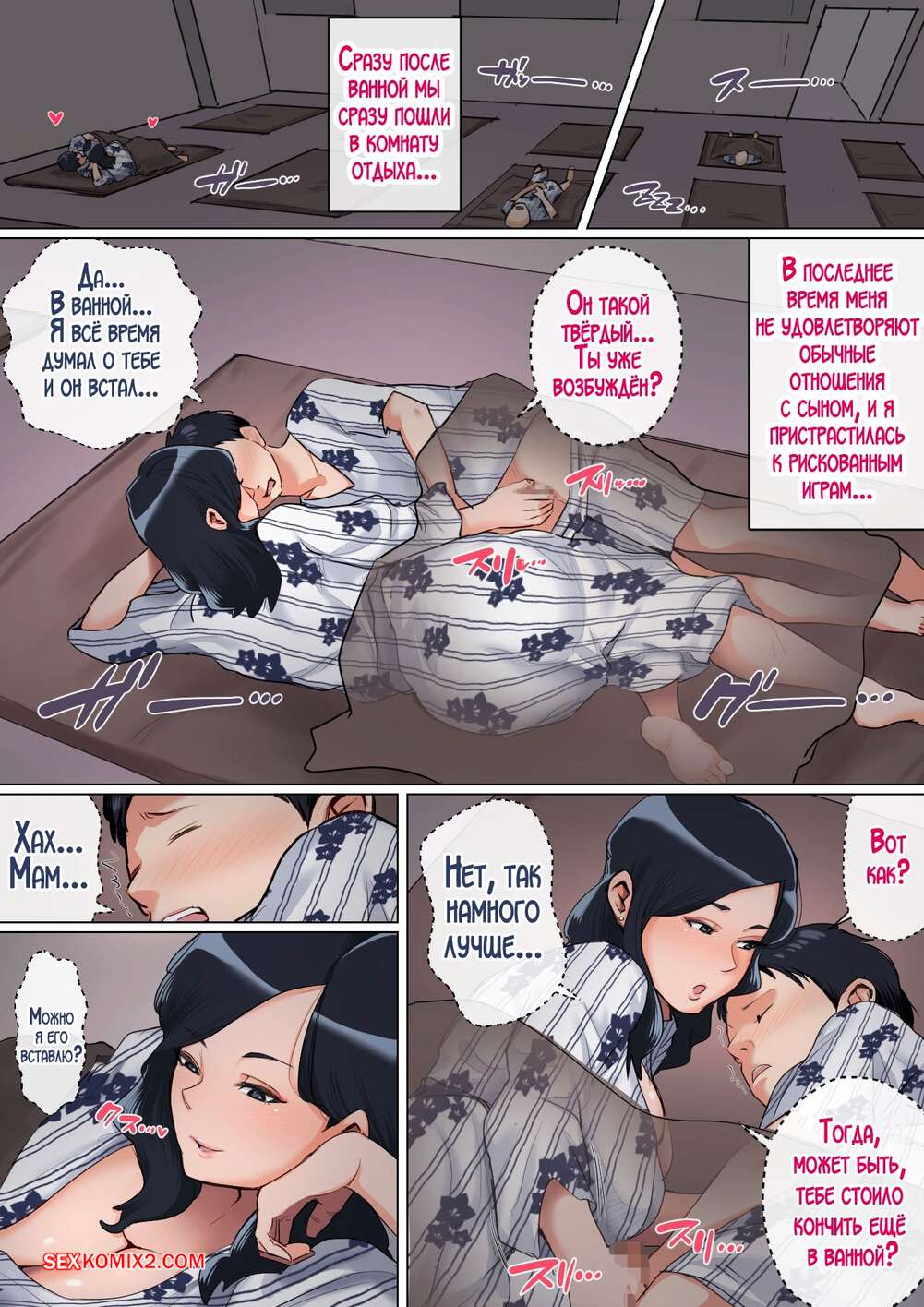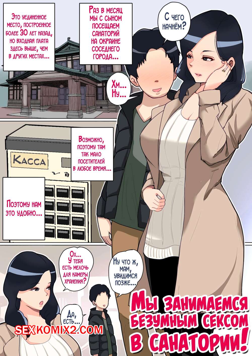 Порно комикс Мы занимаемся безумным сексом в санатории. Natsume Benkei Семья отправилась в санаторий, но муж постоянно занят работой и не обращает внимание на жену. Красотке это надоело, поэтому она соблазняет сына, чтобы он ее трахнул.