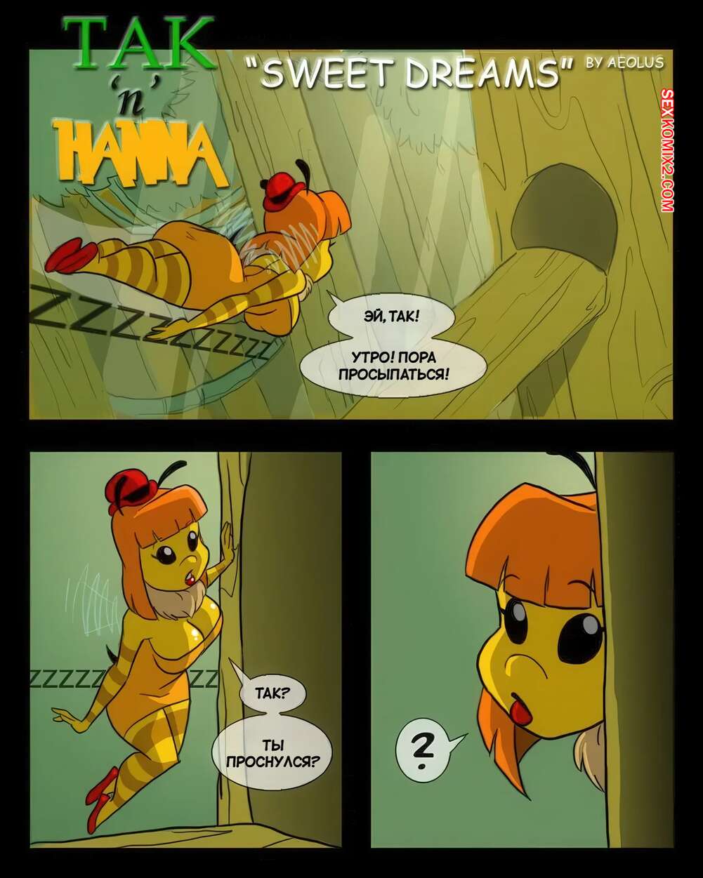 Порно комикс Сладкие сны. Sweet Dreams. Aeolus. Девушка пчелка прилетела с утра к парню и застала у него стояк. Красотка возбудилась и стала отсасывать ему, после чего села на него своей пиздой и дала себя выебать.