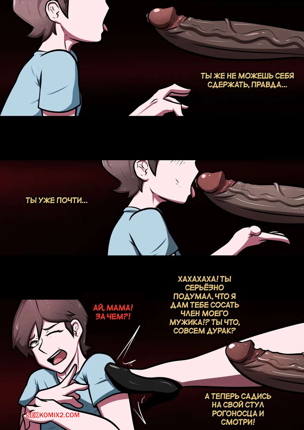 Порно комикс Нетотарэ мамы. NTR mom. MicroChip69. Горячая милфа без ума от огромного члена темнокожего парня. Она разделась и стала глубоко заглатывать его хуй, после чего раздвинула ножки и дала выебать свою задницу.