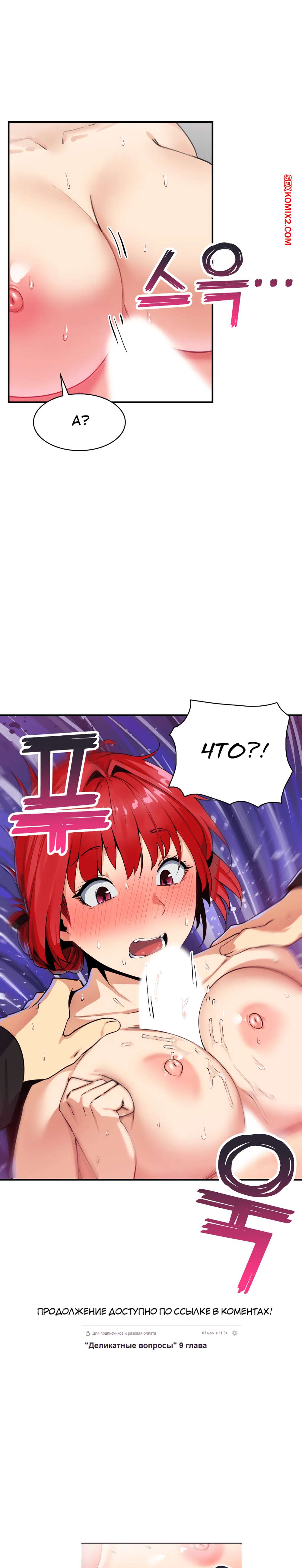 Порно комикс Деликатные вопросы. Части 7 и 8 и 9. Sensitive issues Сучка стала постоянно уединяться со своим коллегой по работе. Там они начинают проявляться всю свою страсть, лаская друг друга, а затем хорошенько ебутся и идут продолжать работу.