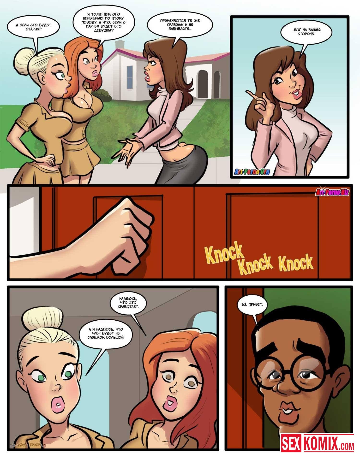 Порно комикс Лазейка в рай. Часть 4. Очень сексуальная блондинка ходит по домам и просит сборы для церкви. Поскольку ей очень часто попадаются парни, девушка решила одеться более вызывающе, сделать свою грудь больше, чтобы обратить на нее внимание парней. Ей это очень хорошо удалось, так как пожертвование она начала собирать очень крупными суммами. Но при этом ей приходилось неплохо работать, в основном удовлетворять этих самых парней.