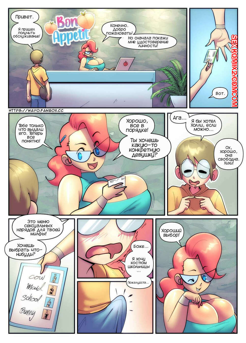 Порно комикс Приятного аппетита. Bon Appetit. Wayo. Парень повзрослел и теперь он хочет трахнуть девушку из борделя о которой так давно мечтал. Он собрал все свои сбережения и отправился в путь.
