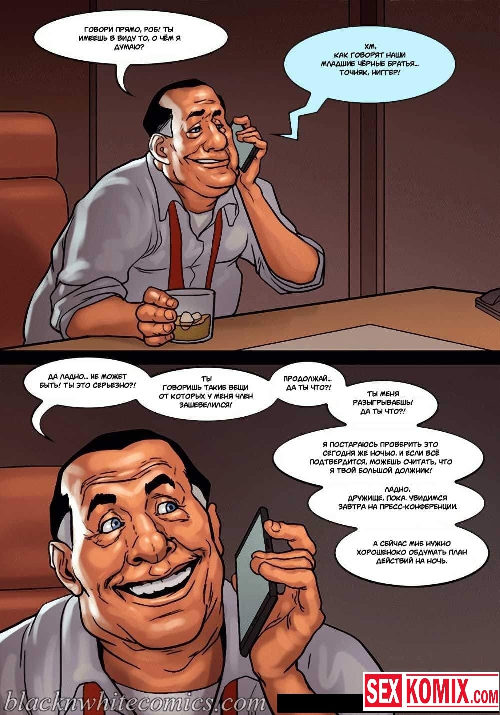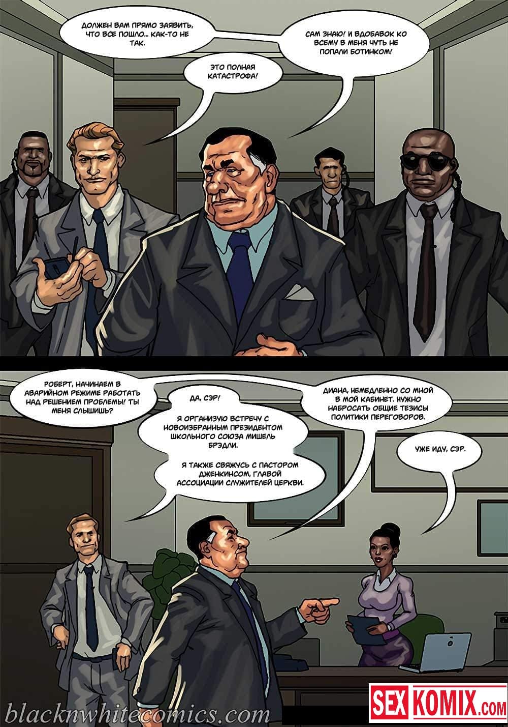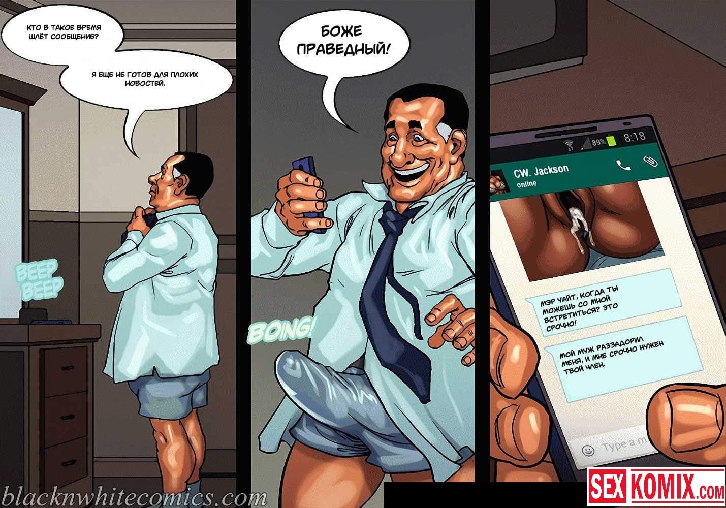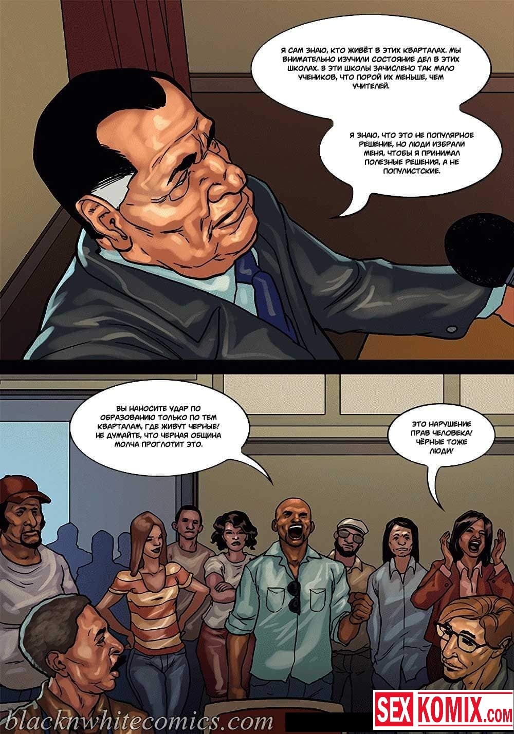Порно комикс Мэр. Часть 3. Развратный мужчина очень любит заниматься сексом с девушками, и поскольку он является мэром города, в его власти почти все девушки этого города. Несмотря на то, что он женат и очень сильно любит свою жену, ему все равно хватает сил соблазнять и заниматься сексом с разными красотками. И даже когда ему приехала в гости знакомая чернокожая девушка. Ночью, когда она пошла попить воды, он её подкараулил возле холодильника и прямо на кухне трахнул, пока его жена спала.