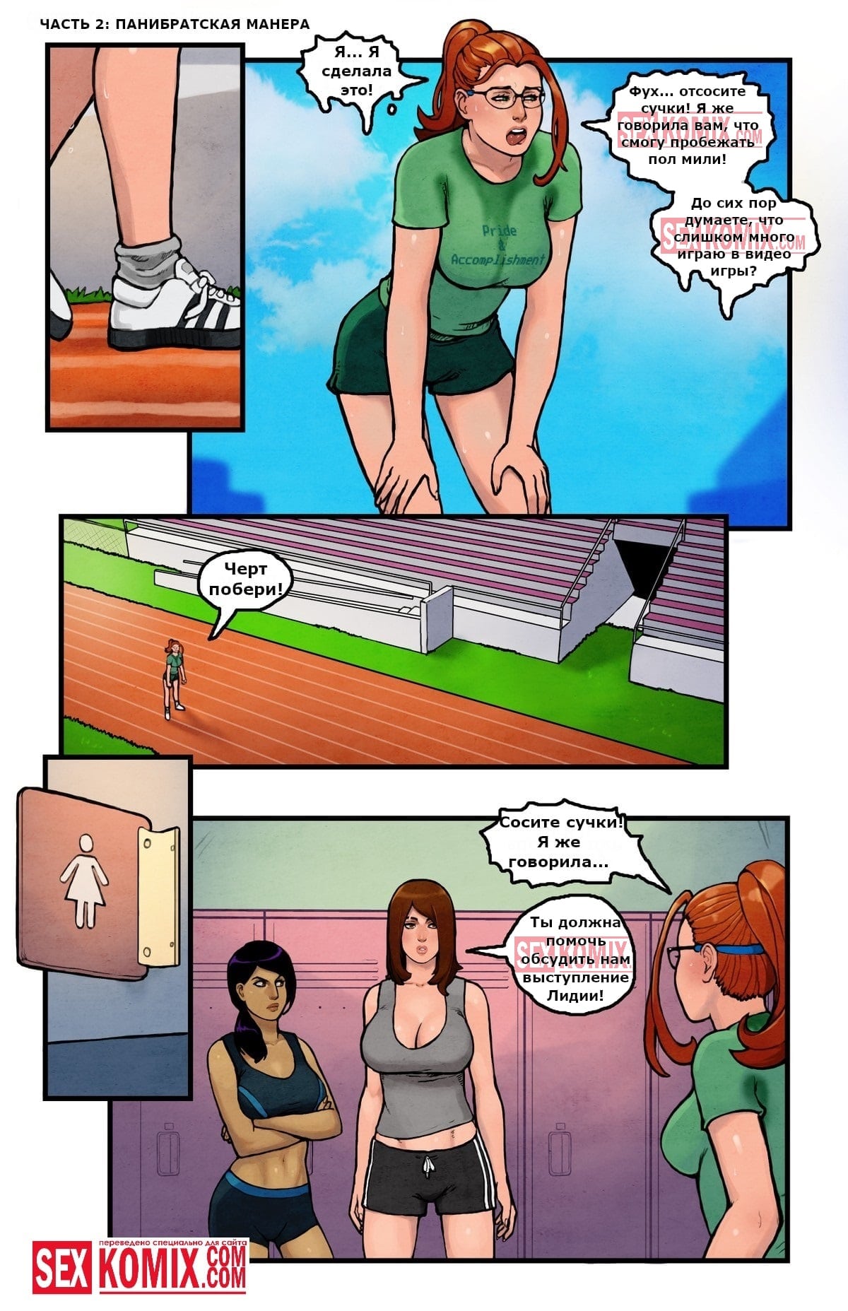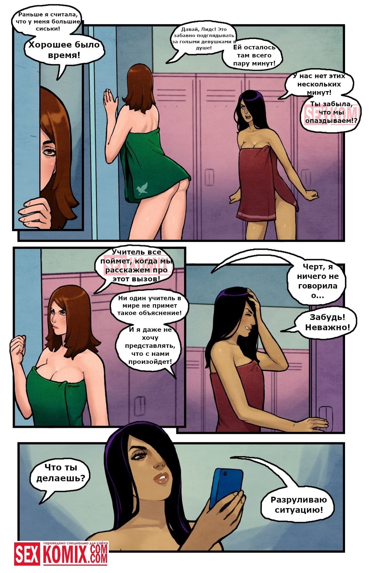 Порно комикс Романтический мир. Часть 2. Очень упертая девушка занимается спортом и бегает по стадиону, когда ее тяжелая тренировка закончилась, она пошла в раздевалку, чтобы принять душ и переодеться. В душевой она встретилась со своей знакомой девушкой, спортсменка уже очень давно положила глаз на неё. и хотелось заняться с ней сексом. Когда она предложила поцеловаться, девушка была в недоумении, она не ожидала, что ее подруга лесбиянка. Но все же согласилась и они отлично позабавились в душе.