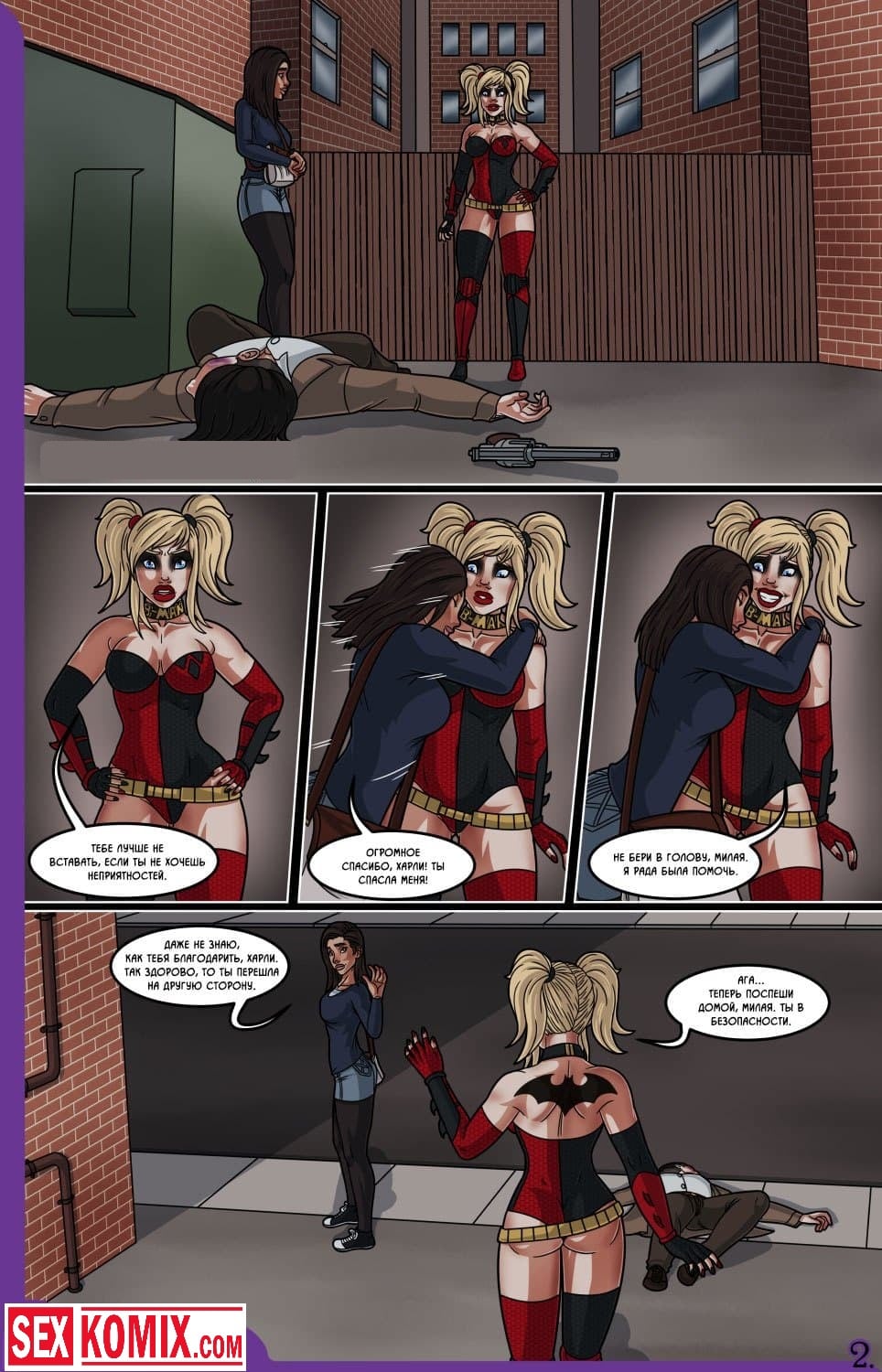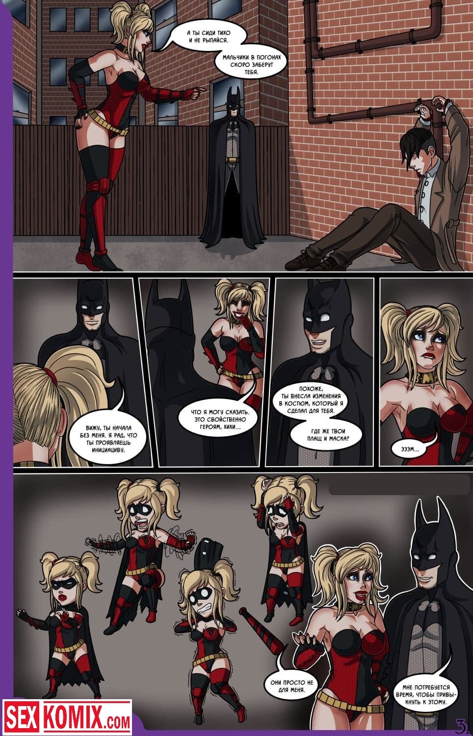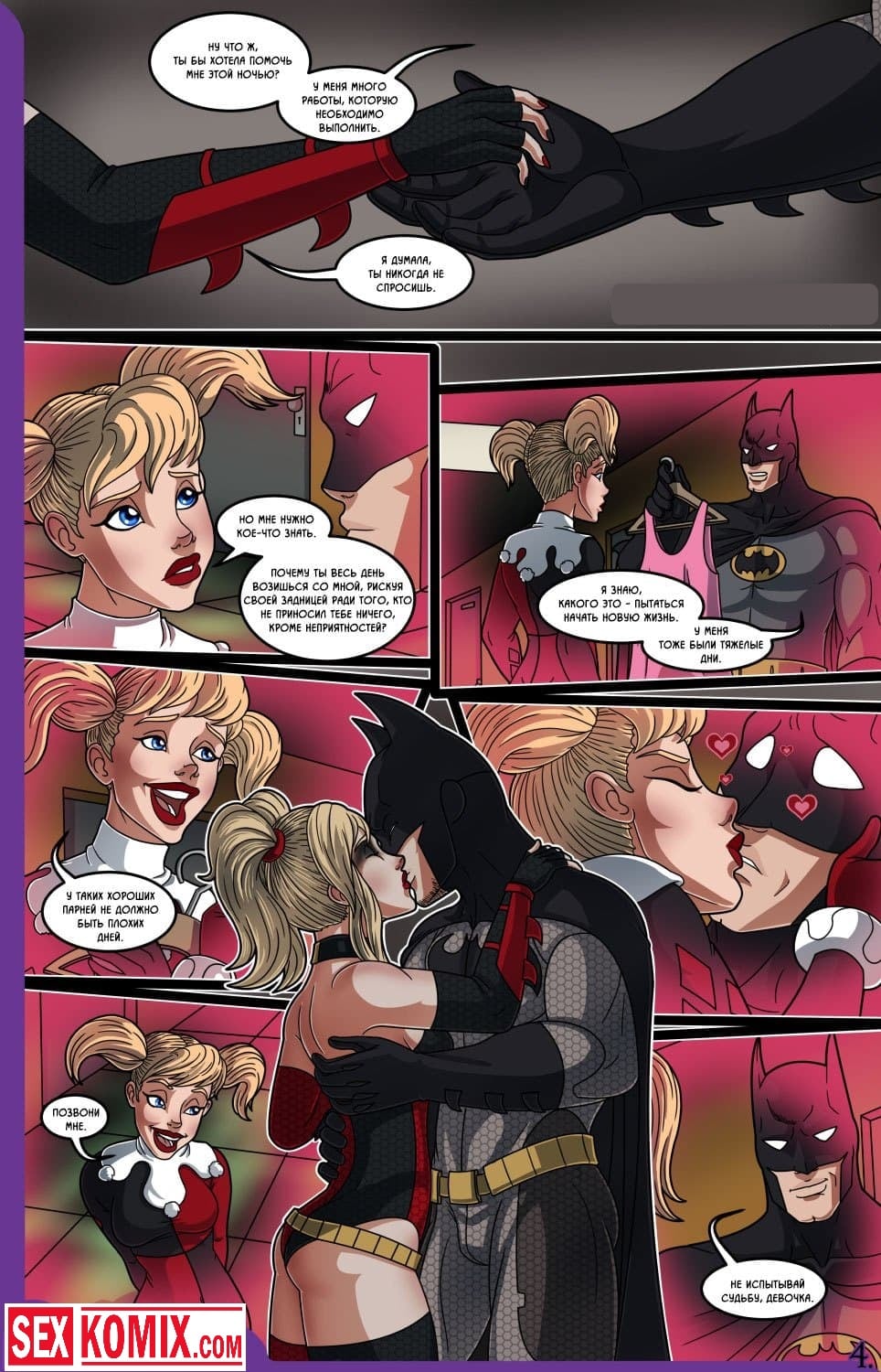 Порно комикс Влюбленный Бэтмен. Человека-летучую мышь вызвали на очередное место преступления. Когда он пришёл, то обнаружил грабителя. Он похитил много денег из банка и пытался скрыться. На его пути возникла сексуальная красотка по имени Харли Квинн она вырубило бандита своей битой, и связала его. Бэтмен все это увидел, он предложил девушке стать его напарницей. Но она отказалась, вместо этого красотка согласилась провести время супергероем, и в конце вечера позволила ему себя трахнуть.
