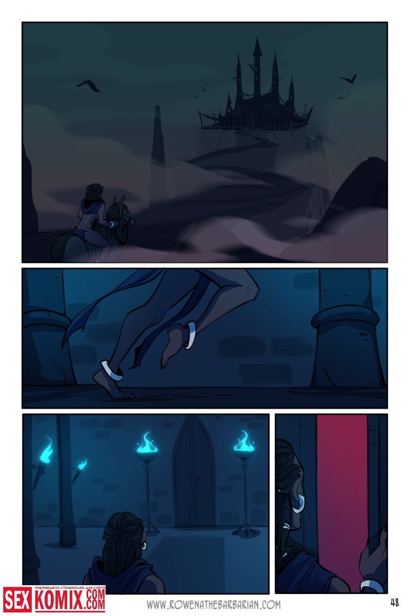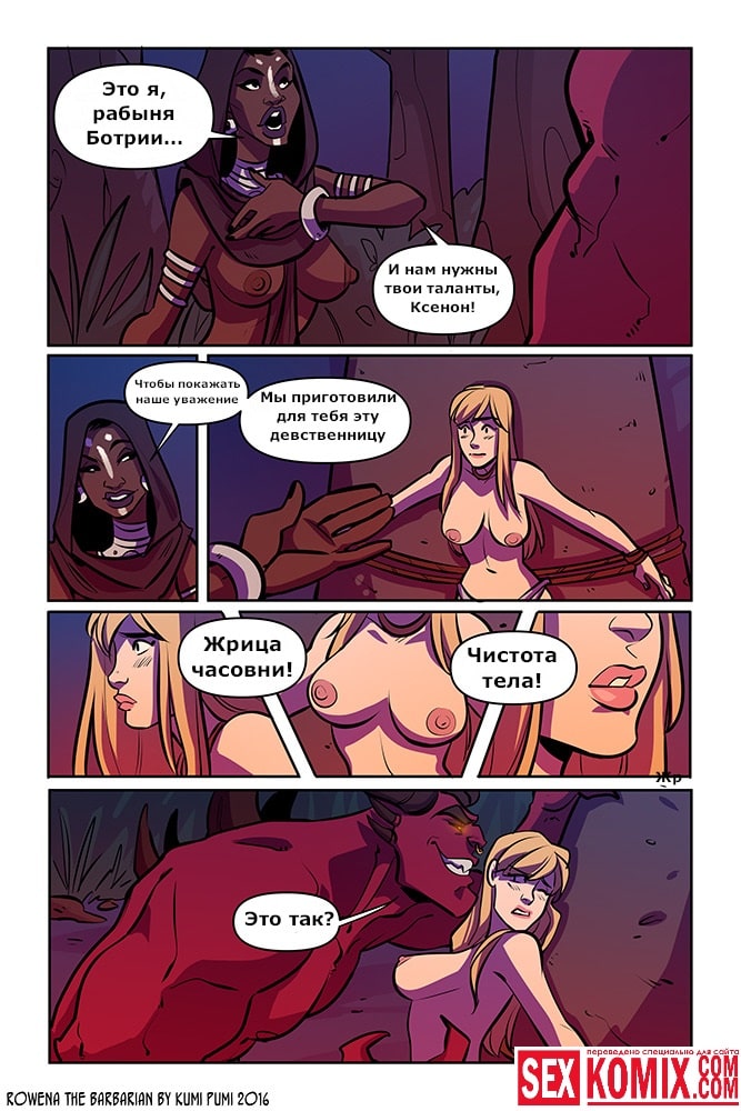 Порно комикс Ровена Варвар. Две путешественницы встретили в таверне мужчину, который просил помощи, т.к неизвестные похитили его сестру. Девушки согласились помочь. Найдя в лесу пленницу, они увидели что девушка привязана к камню и над ней хотят совершить обряд. Извне появился демон с большим членом и решил лишить девушку девственности. Тут началась битва, и демон захватил одну из путешественниц и трахнул её своим огромным членом.